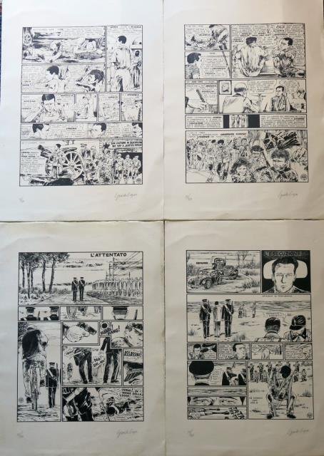 A cura del Comitato Permanente Antifascista del Comune di Rosignano Marittimo. Cartella editoriale in modesta carta bianca contenente quattro tavole in litografia, cm 50 x 70 (il foglio), su fogli della "Gaphis Arte Livorno". Nel figurato, sempre come parte dell'inciso, le tavole recano il marchietto – firma entro cerchietto "Guido Crepax '80". Al margine bianco inferiore, fuori dalla figurazione, le tavole sono tutte numerate e firmate a lapis di mano dall'artista (in basso a sinistra, 35/100 – in basso a destra, Guido Crepax). La cartella è stata realizzata per il Comune di Rosignano Marittimo in occasione dei quarantaquattro anni dalla morte di Oberdan Chiesa, a cui il grande disegnatore e fumettista italiano ha dedicato quattro tavole. La prima tavola ritrae il combattente antifascista in Algeria, nel settembre del 1936, fino al suo raggiungimento del fronte a Pena Ustan, con la Colonna Libertà Catalana, e al suo entrare come artigliere nella brigata internazionale franco – belga. La seconda tavola lo ritrae a Valencia, nel 1936; segue il ritorno in Italia, l'arresto e la detenzione in carcere, a Livorno. Le tavole tre e quattro sono rispettivamente relative all'attentato e all'esecuzione. La terza tavola è dedicata all'azione partigiana che costò la vita a un carabiniere a Rosignano Solvay, e per la quale Oberdan Chiesa subì la rappresaglia da parte dei nazi – fascisti che lo fucilarono sulla spiaggia di Rosignano il 29 gennaio 1944 (a quest'ultimo episodio è dedicata la quarta tavola). La cartella è interessata da tracce di umido, le tavole, tranne un leggerissimo foxing marginale a due di queste, sono tutte ben impresse e in buono stato di conservazione.