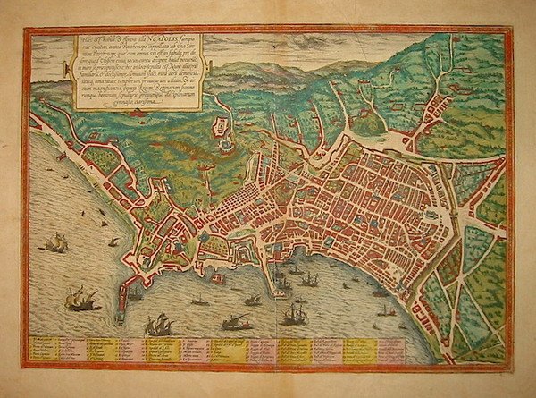 Incisione originale su rame (cm. 48x33,5 più ampi margini) dalla celebre e monumentale opera ‘Civitates Orbis Terrarum’ pubblicata tra il 1572 ed il 1617. Splendida coloritura coeva. Minuscolo forellino lungo la piega centrale, ma esemplare in ottimo stato di conservazione.