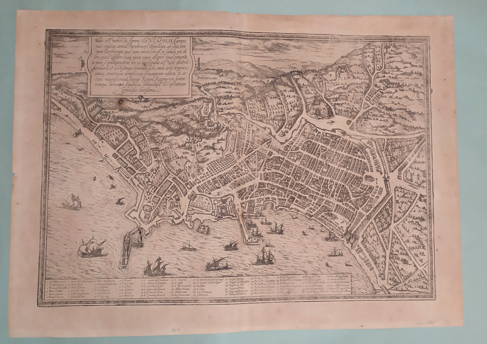 BRAUN HOGENBERG. Haec est nobilis & florens illa Neapolis. Colonia, 1572. Cm.34x 48 oltre margini. Incisione su rame. In alto a sinistra cartiglio, legenda in basso, piccolo foro sotto il cartiglio. La Città di Napoli tra vedutismo e cartografia, pag.64, n.14.