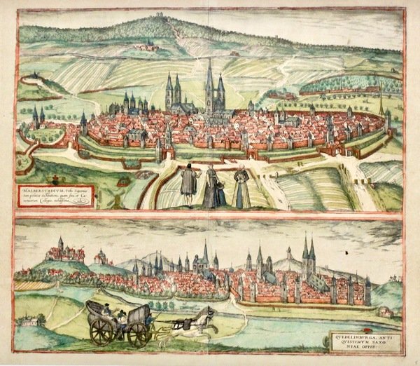 Incisione in rame, mm 370x420, colorata a mano. Due riquadri con vedute delle città sassoni di Halberstadt e Quedlinburg. <BR>Tratta da "Civitates Orbis Terrarum", pietra miliare del vedutismo, pubblicata in anni differenti dal 1572 al 1615 ca. in 6 volumi. Bell'esemplare, su carta uniformemente ingiallita, con mancanza dell'angolo superiore destro (che non interessa la tavola). <BR>