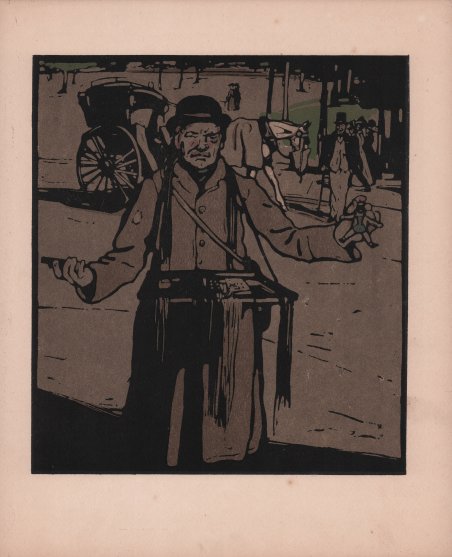Un venditore ambulante in piedi, con un vassoio di merci appeso al collo, brandendo un giocattolo e un'altra sua merce in ogni mano. Xilografia colorata a mano, 1898, stampata su carta color crema. Da una serie di tredici tavole pubblicate da William Heinemann, Londra, nel novembre 1898, detta ' London Types ' . William Nicholson creò i suoi ' London Types ' nel 1898. Si trattava di una serie di immagini che, insieme all’Almanac of Twelve Sports ' e al ' An Illustrated Alphabet, avrebbero creato la sua fama di stampatore. Lavorando nell'ambito della cultura della stampa popolare britannica, Nicholson scelse deliberatamente di utilizzare un solco “grosso” del blocco per le sue incisioni su legno. Si tratta di uno stile che deve più a Toulouse Lautrec e ai precedenti giapponesi che alle tradizioni visive autoctone, il che conferisce al suo lavoro una qualità innovativa, anche se, apparentemente, sembra celebrare i ruoli tradizionali della società britannica. Anche se non si tratta propriamente di ' Cries of London ' (le famose incisioni sui mestieri nella città relative al secolo precedente), alcuni di questi personaggi di strada sono familiari grazie alle stampe precedenti e Nicholson li ritrae come curiosità di un'altra epoca. I ' London Types ' di William Nicholson forniscono un contributo distintivo alle innumerevoli serie di immagini che hanno ritratto la vita di strada nel corso dei secoli, notevoli sia per la loro superlativa eleganza grafica sia come ritratto sociale complesso e spiritoso della Londra all'alba del XX secolo. Perfetto stato di conservazione. Bibliografia Campbell 1992, ' William Nicholson, the graphic work ' (53). Standing with a tray of goods suspended from his neck, brandishing a toy and another his ware in each hand. Hand-coloured woodcut, 1898, printed on a cream board. From a series of thirteen plates published by William Heinemann, London, in November 1898. William Nicholson created his ' London Types ' in 1898. They were a set of images that, alongside his ' Almanac of Twelve Sports ' and ' An Illustrated Alphabet, ' were to make his reputation as a printmaker. Working within the culture of the British popular print, Nicholson deliberately chose to use the coarse-grained side of the block in his wood cuts. This was a style that owed more to Toulouse Lautrec and Japanese precedents than to native visual traditions, which gave his work an innovative quality, even as he appeared to be celebrating traditional roles in British society. Although not strictly ' Cries of London, some of these street characters are familiar from prints stretching back through the previous century and Nicholson portrays them as curiosities from another age. William Nicholson’s ' London Types ' provide a distinctive contribution to the innumerable series of images that have portrayed street life throughout the centuries, remarkable both for their superlative graphic elegance and as a complex and witty social portrait of London at the dawn of the twentieth century. Bibliografia Campbell 1992, ' William Nicholson, the graphic work ' (53). Cfr.