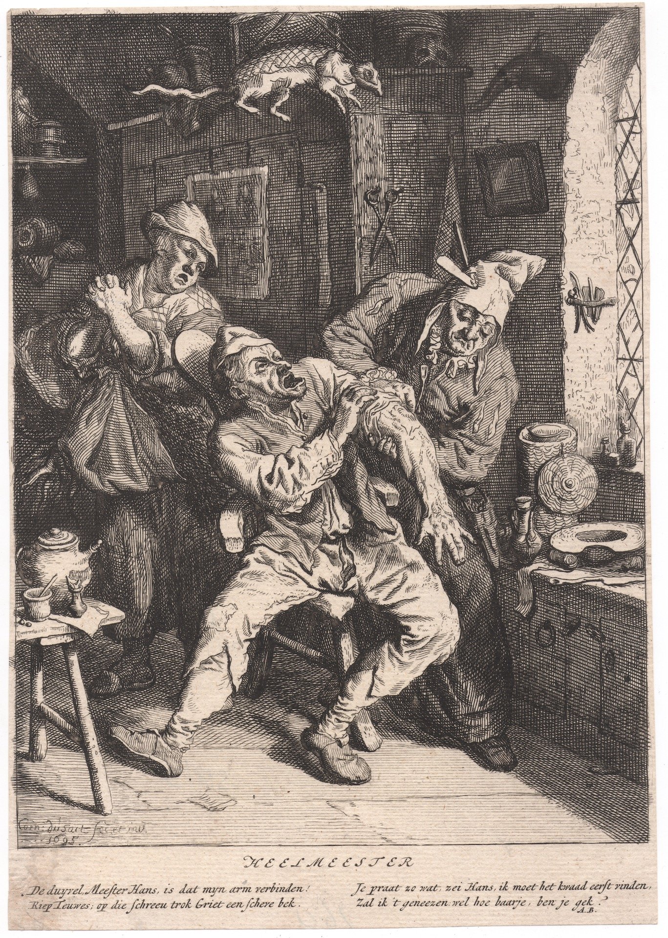 In un interno rustico minuziosamente descritto, ricco di oggetti tipici dello studio di un uomo di scienze, un uomo con un curioso cappuccio disinfetta la ferita ad un braccio di un secondo uomo seduto al centro in un grido di dolore. Alle loro spalle una donna, probabilmente la moglie, regge un fascio di verdure e incrocia le mani in un'espressione fra lo spaventato e lo speranzoso. Il segno largo e profondo crea intensi contrasti chiaroscurali. In basso a sinistra firma e data: Corn. duSart fe. et inv./1695. Nel margine inferiore bianco il titolo: Heelmeester e un distico esplicativo su due colonne firmato: A.B. La mancanza della zona bianca sotto il distico non permette di distinguere se si tratti di un II o di un III stato, nel III stato infatti, in quell'area, viene inciso il privilegio.