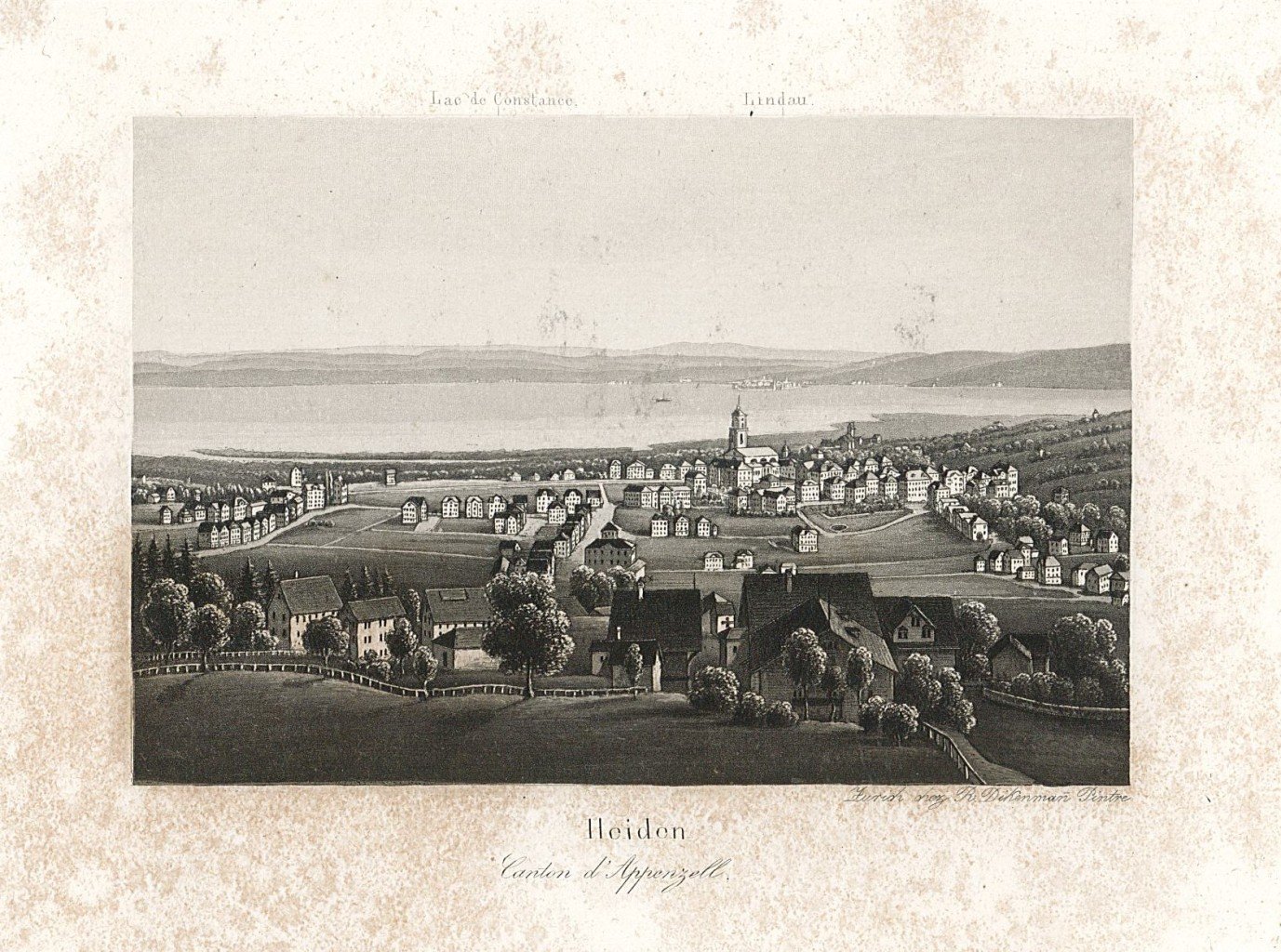 Stampa, antica ed originale, raffigurante la cittadina in raffinata acquatinta. Inserita nell'opera "Souvenir de la Suisse" edita a Zurigo. Autore: Dikenmann Rudolf dis. (1793 Zürich 1883). Luogo: Heiden. Anno: 1860 ca. Tecnica: acquatinta. Dimensioni: 74x112 mm. Leggera ossidatura della carta al margine