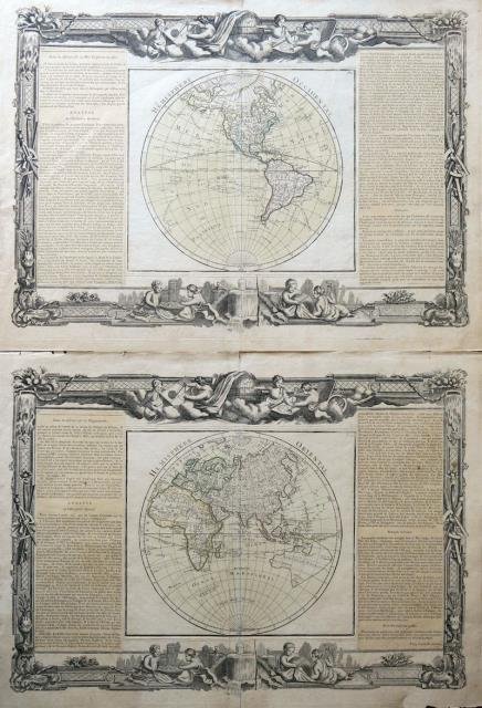 Senza indicazioni editoriali (ma Paris, 1778 circa). Coppia di incisioni in rame all'acquaforte, confini in colore d'epoca, cm 41 x 55,5 circa (il foglio) più margini. In entrambe le carte la rappresentazione è inquadrata da una ricca cornice decorativa con elementi di decoro, composizioni e putti con strumenti cartografici, il globo è al centro della carta, ai lati sono riportate (su carta dell'epoca) due ampie strisce descrittive in lingua francese. Guillaume de L’Isle o Guillaume Delisle (Parigi, 1675 - Parigi, 1726) geografo e cartografo francese. Entrambi gli esemplari sono in buono stato di conservazione. .