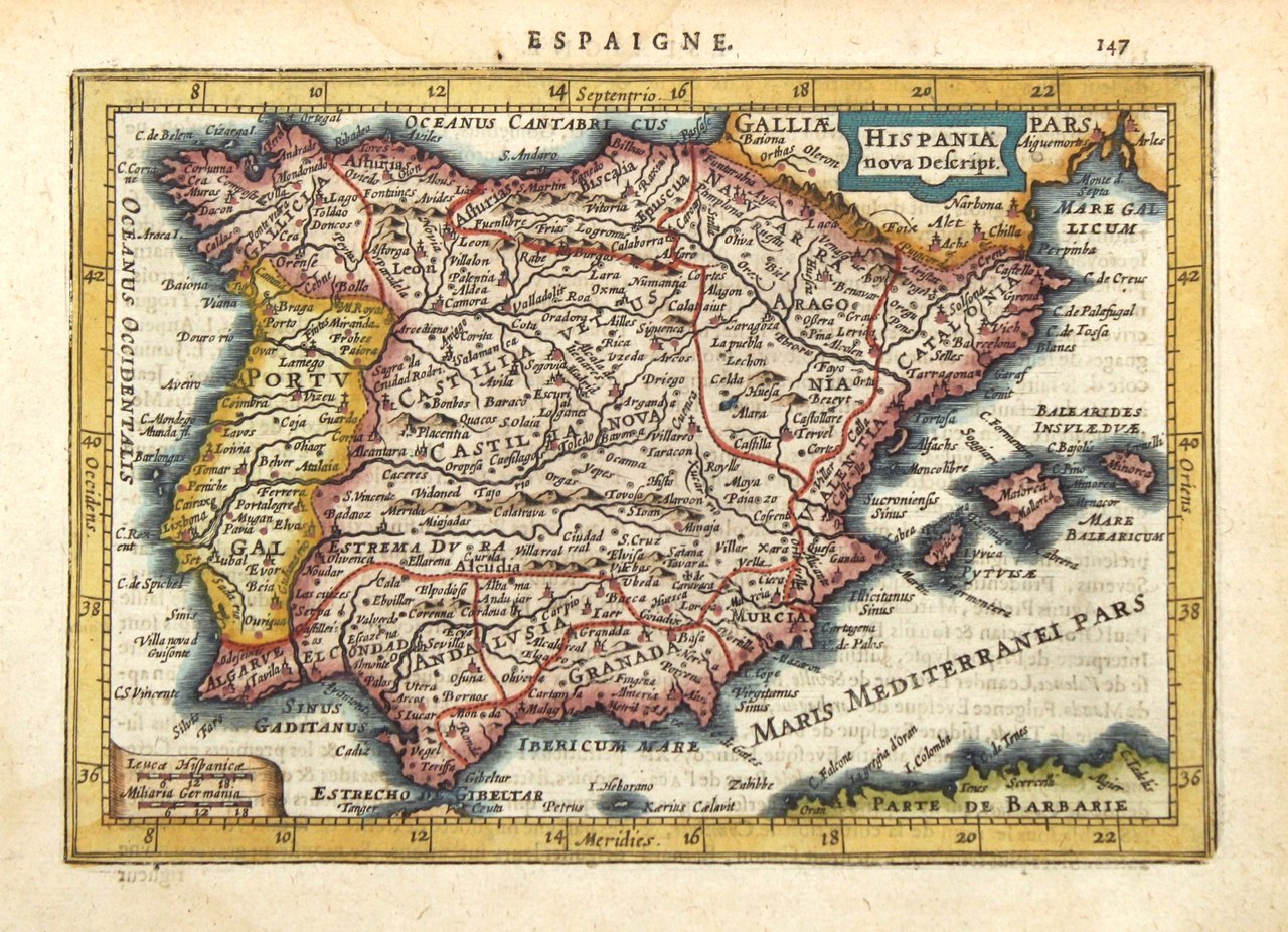 Incisione in rame, mm 135x193. Tratta dall'edizione di Janssonius dell'"Atlas Minor" di Hondius, pubblicato nel 1606 per la prima volta dopo l'acquisto, da parte del costruttore di globi Hondius, delle lastre di Mercatore con l'aggiunta di lastre originali di propria creazione. Buon esemplare con qualche leggero alone.