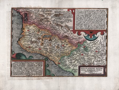 Una delle prime mappe pubblicate dedicate esclusivamente al Messico, basata sull'opera di Abraham Ortelius.La mappa è piena di nomi di luoghi che includono città, fiumi, miniere, montagne. Il testo in basso a sinistra fornisce informazioni sui posti numerati sulla mappa, quello in alto a destra fornisce informazioni sul Paese. Entrambi i testi sono in latino. Bella e rara carta, tratta dall'opera di M. Quad ' Fasciculus Geographicus Complectens Praeciparum Totius orbis Regionum tabulas circiter centum. una cum earundum Enarrationibus ' edito a Colonia da J. Bussemacher, nel 1608. Matthaus Quad era un cartografo tedesco con sede a Colonia. La carta fu incisa da Johannes Bussemacher e apparve in diverse opere geografiche pubblicate da Quad e Bussemacher alla fine del XVI e all'inizio del XVII secolo. Matthias Quad (1557-1613), editore di carte geografiche con sede a Colonia, fu formato nei Paesi Bassi da Johannes van Doetecum, che lavorava anche con i De Jode. Quad utilizzò molte mappe di De Jode come base a cui aggiunse informazioni e decorazioni. Nel 1592 Quad pubblicò un atlante dell'Europa con 38 mappe. Nel 1594 lo ampliò a 50 mappe. Nel 1600 ampliò ulteriormente la collezione di mappe, questa volta fino a 82, e chiamò l'atlante ' Geographisch Handtbuch. Tutti e tre gli atlanti erano di piccole dimensioni, il che consentiva loro di competere come alternative più economiche ai grandi atlanti di Ortelius, Mercatore e De Jode. Quad pubblicò un altro atlante, nel 1608, con 86 mappe, il ' Fascilus Geographicus. Acquaforte, finemente colorata a mano, in ottimo stato di conservazione. Testo tedesco al verso. One of the earliest obtainable separately published maps of Mexico, based on the work of Abraham Ortelius.The map is filled with early place names for towns, rivers, mines, mountains, etc. Text at lower left gives information about places numbered on map, text at upper right gives information about the whole country. Both texts are in Latin, with strapwork borders. From ' a German edition of Fasciculus ' Geographicus Complectens Praeciparum Totius orbis Regionum tabulas circiter centum. una cum earundum Enarrationibus, Cologne, J. Bussemacher, 1608. Matthaus Quad was a German cartographer based in Cologne. The map was engraved by Johannes Bussemacher and appeared in several Geographical works published by Quad and Bussemacher at the end of the 16th and beginning of the 17th century. Matthias Quad (1557-1613), a map publisher based in Cologne, was trained in the Netherlands by Johannes van Doetecum, who also worked with the De Jodes. Quad used many De Jode maps as a base to which he added additional information and decorations. Quad was best known for his atlases, which were part of the first boom in atlases best characterized by Abraham Ortelius’ Theatrum Orbis Terrarum. In 1592, Quad released an atlas of Europe that had 38 maps. He expanded it in 1594 to 50 maps. In 1600, he expanded the collection of maps further still, this time to 82 maps, and called the atlas, Geographisch Handtbuch. All three were small in size, allowing them to compete as cheaper alternatives to the larger atlases of Ortelius, Mercator, and the De Jodes. Quad released one other atlas, in 1608, with 86 maps, the ' Fascilus Geographicus. Etching with fine later hand colour, good condition. Cfr.