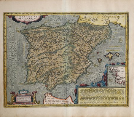 Splendida carta storico-geografica dell’antica Spagna, pubblicata nel ' Parergon ' di Abraham Ortelius. Esemplare dalla rara edizione italiana del Theatrum Orbis Terrarum stampata ad Anversa da Jean Baptiste Vrients nel 1608 e quindi nel 1612. Un secondo stato della lastra; a partire dal 1601: "Barbarium prom" è stato aggiunto a sud della foce del fiume Tago, e le scritte in mare ovunque sono state completate con una puntinatura. Il toponimo "Cinnaria" all'inizio dell'ottava riga dei luoghi di ubicazione incerta, in basso a destra, è stato cancellato. Titolo: HISPANIAE VE:|TERIS DESCRIPTIO. | Ex conatibus Geographicis | Abrah. Ortelij. Cartiglio in basso a sinistra: "Priuilegio Imp. Reg. et | Belgico, ad decennium. | 1586". | SVMMO THEOLOGO DNO D. BENE:|DICTO ARIÆ MONTANO; VIRO | LINGVARVM COGNITIONE, RERVM | PERITIA, ET VITAE INTEGRITATE | MAGNO; ABRAH. ORTELIVS AMICITI:|TIÆ ET OBSERVANTIÆ ERGO, DD. [Con privilegio imperiale, reale e belga per dieci anni. 1586. Dedicato all'eccellente teologo Benedictus Arias Montanus, uomo molto versato nelle lingue, esperto in materia e di grande integrità nella vita, da Abraham Ortelius in amicizia e con la dovuta riverenza]. Cartiglio in basso a destra: HISPANIÆ LOCA ALIQVOT INCOGNITÆ POSITIONIS. [Alcuni luoghi della Spagna di ubicazione sconosciuta seguiti da 17 righe con popoli, luoghi, montagne, fiumi e fonti di ubicazione sconosciuta]. Inserto, 80 x 70 mm: GADES (Cadice) e dintorni. Realizzata da Ortelius sulla base di informazioni moderne tratte dalla carta della Spagna in sei fogli di Clusius, apparsa nel 1571 (Meurer p. 127-129) e di conoscenze antiche tratte da Strabone, Appiano, Livio, Valerio Massimo e Svetonio. Nel 1593 Barbosa chiede a Ortelius (Hessels 240, 258) di correggere alcuni nomi di luoghi. La seconda lettera (1594) indica che queste correzioni sono state effettuate. Bertius acquistò alcuni fogli con questa mappa e la incluse nel suo storico atlante del 1619 "Theatrum Geographiæ Veteris". Una copia fedele di questa carta fu realizzata da Schottus nella sua opera Hispaniæ Illustratæ seu rerum Urbinumque Hispaniæ, Lusatiæ, Æthiopiæ et Indiæ Scriptes Varii, Francoforte 1603-1608. Circa una decade dopo la pubblicazione del “moderno” Theatrum Orbis Terrarum, Ortelius rispose alle “preghiere di amici e studiosi di storia antica, sacra e profana” e compilò una serie di mappe di soggetto biblico e classico, quasi tutte disegnate da lui. Intitolò l’opera “Parergon theatri”, ovvero “aggiunta, appendice, del Theatrum”, ma al tempo stesso anche complementare al Theatrum: il Paregon theatri forniva per il mondo antico lo stesso materiale che Ortelius aveva fornito per il mondo moderno con il Theatrum: carte geografiche. Lo spirito del Parergon è tutto riassunto nel motto historiae oculus geographia riportato sul frontespizio: la geografia è l’occhio della storia. Le mappe del mondo antico avevano lo scopo di “rendere più chiari gli storici antichi e i poeti”. Le mappe del Paregon sono di tre tipologie: antiche regioni; carte letterarie e carte bibliche. Come sottolinea Koeman “il Parergon deve essere considerato come lavoro personale di Ortelius. Per quest'opera, infatti, diversamente dal Theatrum, non copiò le mappe di altri cartografi, ma ne disegnò lui stesso di nuove ed originali. Riprese luoghi, regioni e territori delle civiltà classiche illustrandone e spiegandone la storia, una materia molto vicina al suo cuore. Le mappe e le lastre del Parergon devono essere valutate come le più importanti incisioni che rappresentano il diffuso interesse per la geografia classica nel XVI secolo”. “Questa è quella guerriera & nobile Spagna d'huomini & animi la prima region d'Europa inver Ponente contenuta; la qual d' ogni intorno dal pelago cinta si discerne, senon fu la dove dalli monti Pirenei vien distinta, come da riparo & fortezza naturale" (p. x). Nella Naturalis Historia di Plinio la descrizione della . Splendid historical map of Spain, published in Abraham Ortelius' Parergon. Example from the rare Italian edition of Theatrum Orbis Terrarum printed in Antwerp by Jean Baptiste Vrients in 1608 and then in 1612. A second state of the plate; from 1601 onwards: "Barbarium prom" was added south of the mouth of the river Tagus, and the lettering in the sea everywhere was filled in with stippling. The place name "Cinnaria" at the beginning of the 8th line of places of uncertain location, bottom right, was crossed out. Title: HISPANIAE VE:|TERIS DESCRIPTIO. | "Ex conatibus Geographicis | Abrah. Ortelij. Cartouche bottom left: "Priuilegio Imp. Reg. et | Belgico, ad decennium. | 1586". | SVMMO THEOLOGO DNO D. BENE:|DICTO ARIÆ MONTANO; VIRO | LINGVARVM COGNITIONE, RERVM | PERITIA, ET VITAE INTEGRITATE | MAGNO; ABRAH. ORTELIVS AMICITI:|TIÆ ET OBSERVANTIÆ ERGO, DD. [With an imperial, royal and Belgian privilege for ten years. 1586. Dedicated to the excellent theologist lord Benedictus Arias Montanus, a man well versed in languages, knowledgeable in matters, and with great integrity in life by Abraham Ortelius in friendship and due reverence]. Cartouche bottom right: HISPANIÆ LOCA ALIQVOT INCOGNITÆ POSITIONIS. [Some places in Spain of unknown location followed by 17 lines with peoples, places, mountains, rivers and sources of unknown location]. Inset, 80 x 70 mm: GADES (Cadiz) and surroundings. Made by Ortelius on the basis of modern information from Clusius' six-sheet map of Spain which appeared in 1571, (Meurer p. 127-129) and ancient knowledge from Strabo, Appianus, Livius, Valerius Maximus and Suetonius. In 1593 Barbosa asks Ortelius (Hessels 240, 258) to correct some place names. The second letter (1594) indicates that these corrections have been carried out. Bertius bought a number of sheets with this map and included the map in his historical 1619 atlas "Theatrum Geographiæ Veteris". A close copy of this map was produced by Schottus in his work Hispaniæ Illustratæ seu rerum Urbinumque 