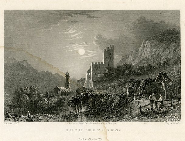 Incisione su acciaio di dimensioni 95x155 mm. Condizioni : USATO - Stato : Buono, ordinari segni d'uso e del tempo. Gora d'acqua nell'angolo inferiore sinistro. Altre note : Bella veduta notturna di Naturno (in tedesco Naturns) illuminata dalla luce lunare. I soggetti principali sono la chiesa parrocchiale dedicata a S. Zeno sulla sinistra e castel Naturno (Hochnaturns) sulla destra. In primo piano sempre sulla destra una coppia chiacchiera ammirando il panorama. La stampa si trova probabilmente in "Views in the Tyrol from drawings by T. Allom after original sketches by Johanna v. Isser geb. Grossrubatscher".