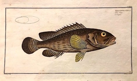 Incisione originale su rame (cm. 37x20,5 più ampi margini bianchi) di Ludwig Schmidt tratta dalla celebre opera ‘Allgemeine Naturgeschichte der Fische’. Carta vergellata con filigrana. Splendida coloritura coeva all’acquarello. Ottimo esemplare.