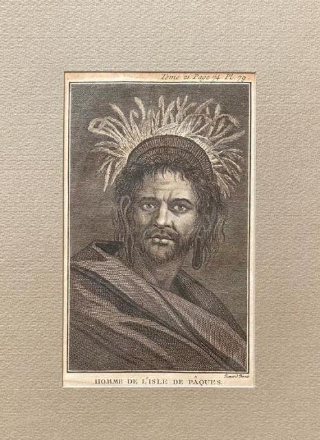 Tratta dall'edizione francese dei "Voyages" di James Cook, uscita nel 1778 a seguito del secondo viaggio di scoperta nei mari del Sud. Incisione in rame all'acquaforte, b/n, cm 12 x 19 (il foglio), in basso a ds. il nome del primo incisore "Benard Direx." (altro nome che collaborò all'inciso è quello di William Hodges), in alto a destra " Tome 21, Page 74, Pl. 79". L'incisione è relativa alla raffigurazione di un abitante indigeno dell'Isola di Pasqua (Polinesia, Pacifico Meridionale, Oceania). Il capitano James Cook (1729 - 1769) scrisse nel 1769: "I segni in generale sono spirali disegnate con grande finezza e perfino eleganza. Un lato corrisponde all'altro. I segni sul corpo somigliano al fogliame di antichi ornamenti cesellati, alle circonvoluzioni di lavori in filigrana, ma in questi hanno una tale ricchezza di forme che su cento che a prima vista sembravano esattamente uguali non ce n'erano due formati allo stesso modo a un esame attento". In buono stato di conservazione. .