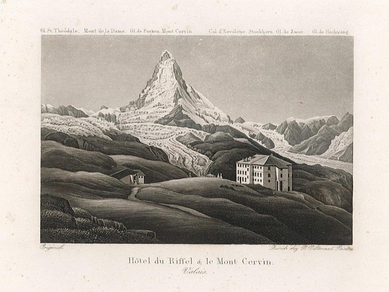 Veduta del Cervino ritratta nei presso dell'Hotel du Riffel. L'Hotel venne ingrandito nel 1864 e portato a 30 camere con 50 letti: prima ne aveva solo 18. Proprio questa modifica aiuta nella datazione dell'opera. Rif: Aliprandi, Gattlen 1978: p. 110