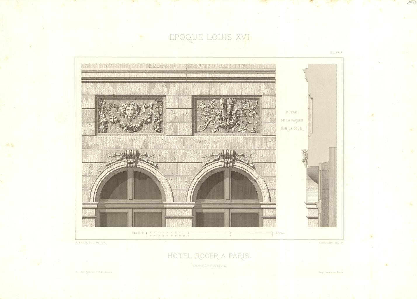 Incisione, antica ed originale, riproducente architetture all'Epoque de Louis XVI re di Francia dal 1774 al 1792. Autore: Pfnor M. Rodolphe delineò & diresse. Luogo: Parigi - Champs Elysees. Anno: 1865. Tecnica: incisione su lastra di rame. Dimensioni: 360x510 mm il foglio.