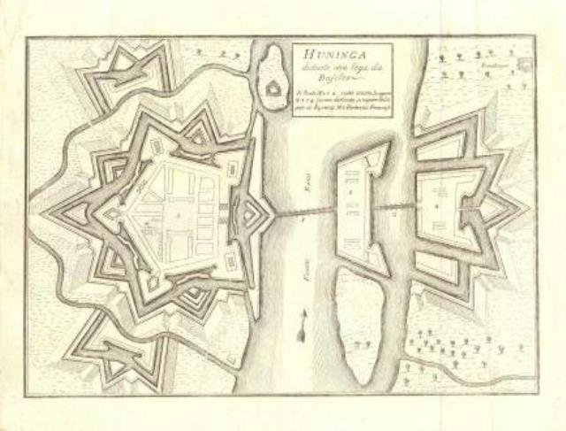 1760 circa. Incisione su rame, b/n, cm 17,5 x 24,5 (alla lastra), più margini. Piantina planimetrica della città con legenda a cinque voci. Huninga è una città a nord di Basilea, capoluogo dell'omonimo cantone nel Dipartimento francese dell'Haut – Rhin (Alto Reno). Buono stato.