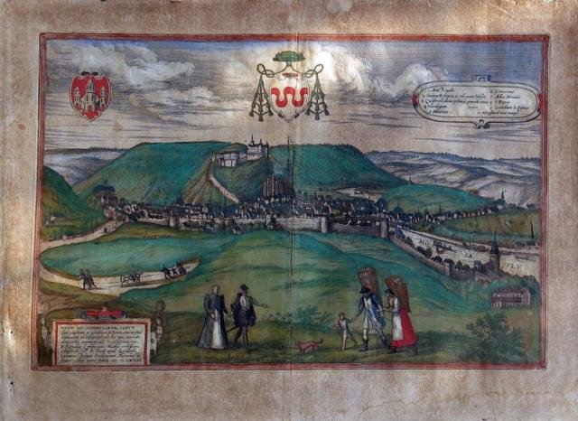 Dal "Civitatus Orbis Terrarum", 1574. Incisione in rame all'acquaforte, colore d'epoca, cm 30,5 x 46,3 (alla lastra), più margini. L'opera rappresenta uno dei libri più importanti sui piani urbanistici divulgati nel corso del XVII secolo. Stemma in alto a sinistra, legenda a 10 voci in alto a destra, cartiglio esplicativo in basso sulla sinistra, che include l'anno di pubblicazione. I Condrusi erano una tribù germanica dell'antico Belgio. La regione geografica moderna di Condroz si pensa che corrisponda grosso modo alla zona dove i Condrusi vissero, Huum l'antico nome della città capitale. Foglio uniformemente e marcatamente ingiallito, rotture della carta sulla destra, a circa metà del margine laterale, bella la coloritura.