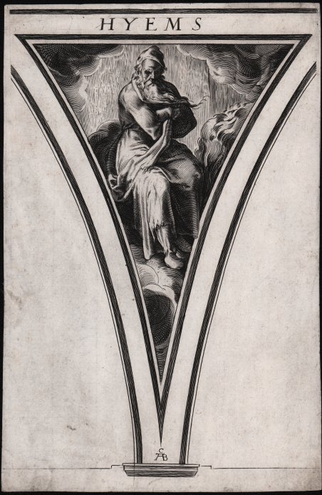Incisione al bulino; il titolo è in alto 'HYEMS', mentre in basso troviamo il monogramma di Alberti 'CAB'. Allegoria dell'inverno, rappresentato come un uomo seduto che incrocia le braccia sul petto. Dalla serie Le quattro stagioni da un soggetto di Polidoro da Caravaggio. Magnifica impressione, stampata con tono su carta vergata contemporanea, rifilata alla linea del rame, minimo restauro all'angolo inferiore destro, per il resto in ottimo stato di conservazione. Esemplare proveniente dalla collezione di John Barnard (Lugt 419). Bibliografia Bartsch, XVII.84.104; Manescalchi, Cherubino Alberti, 136. Engraving, lettered at top 'HYEMS', at bottom Alberti's monogram 'CAB'. Winter (Hyems), represented as a seated man crossing his arms across his chest, a spandrel-shaped composition from the series The Four Seasons after Polidoro da Caravaggio. A fine impression, printed with tone on contemporary laid paper, trimmed to the platemark, perfectly repaired are at the lower right corner, otherwise very good. Ex collection John Barnard (Lugt 419). Literature Bartsch, XVII.84.104; Manescalchi, Cherubino Alberti, 136. Cfr.