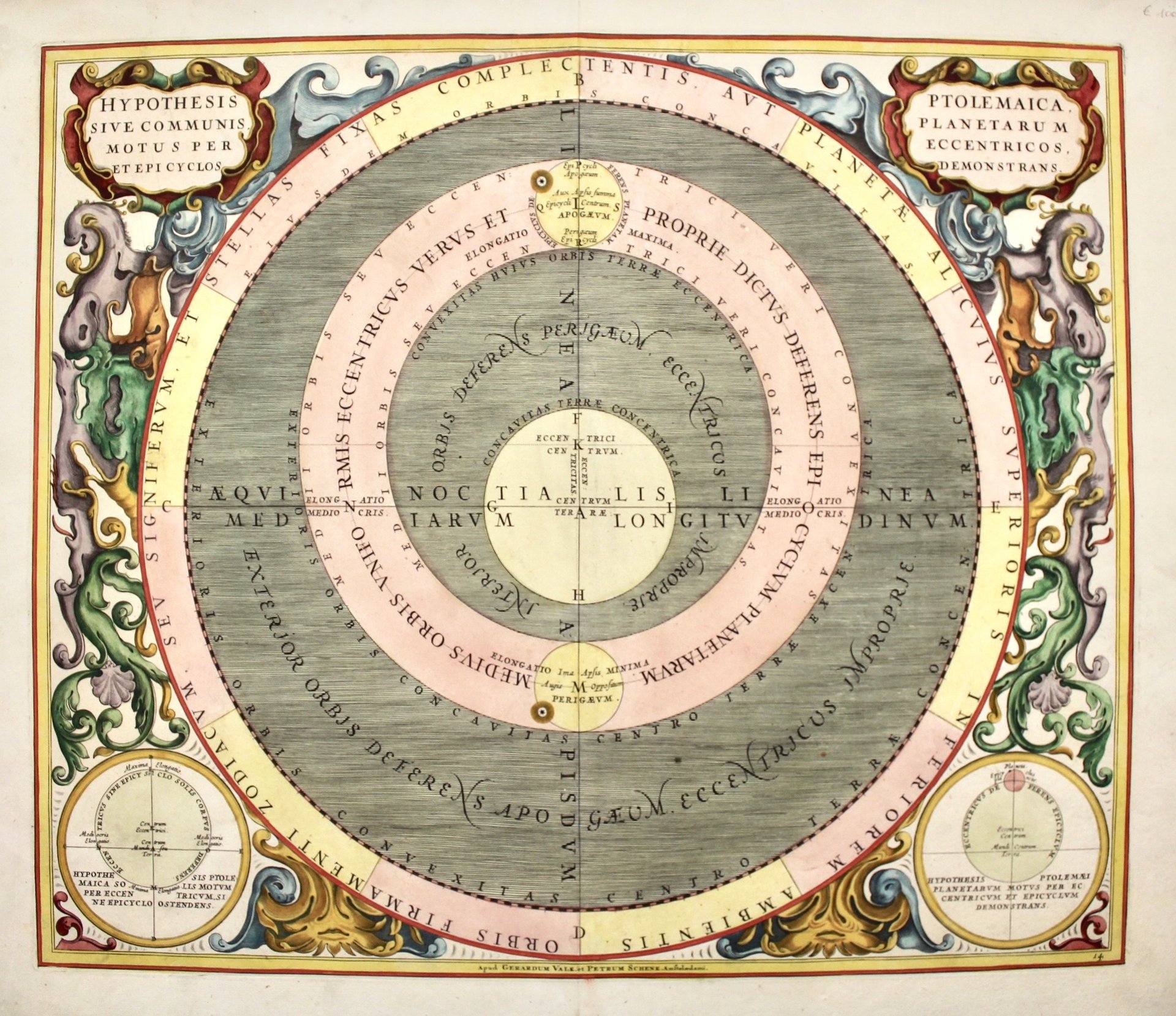 Incisione in rame, coloritura parzialmente antica, mm 450x535, numerata 14. Illustra la teoria tolemaica dell’universo con il moto dei pianeti mostrando la Terra come centro dell'universo e i moti planetari in orbite eccentriche ed epicicliche. Tratta dal più celebre atlante celeste mai pubblicato, “Atlas Coelestis Seu Harmonia Macrocosmica…" di Cellarius, pubblicato in prima edizione da Janssonius nel 1660, senza la numerazione delle tavole in basso a destra e ristampato dagli editori Valk e Schenk a inizio XVIII secolo. La “Harmonia” fu dapprima pubblicata come volume di supplemento del Atlas Novus di Janssonius. L'opera espone graficamente in 29 tavole, le varie teorie sull'universo di Tolomeo, Tycho Brahe, Copernico, riproduce fasi lunari orbite di pianeti e le costellazioni della volta celeste. Bell’esemplare con buoni margini, con rinforzi all’estremità della piega centrale: motivi ornamentali esterni in coloritura posteriore. Andrea Cellario nacque nel 1596 a Neuhausen, e fu educato a Heidelberg. All'inizio del XVII secolo emigrò in Olanda e nel 1637 si trasferì a Hoorn, dove divenne rettore della Scuola Latina. L'opera più nota di Cellarius è la sua Harmonia Macrocosmica, pubblicata per la prima volta nel 1660 da Jan Jansson, come supplemento all'Atlas Novus di Jansson. L'opera consiste in una serie di carte celesti iniziate da Cellarius nel 1647 e destinate a far parte di un trattato in due volumi sulla cosmografia, che non fu mai pubblicato. Potter: "The highpoint of celestial atlas production and the volume that ranks with Blaeu's Atlas Maior". Le carte di Cellarius sono le più ricercate tra le carte celesti, in quanto fondono le suggestive immagini dell'epoca d'oro della cartografia olandese con le conoscenze scientifiche contemporanee. Il presente esemplare proviene dall'edizione Valk & Schenk dell'atlante di Cellarius, invariata rispetto all'edizione del 1661. Le edizioni del 1660 e del 1661 si distinguono per l'inserimento di un numero di lastra nell'angolo inferiore destro dell'edizione del 1661. L'edizione Valk & Schenk si distingue per l'aggiunta del nome dello stampatore (Valk & Schenk) nei titoli delle carte. Warner, The Sky Explored, pp 53-54.