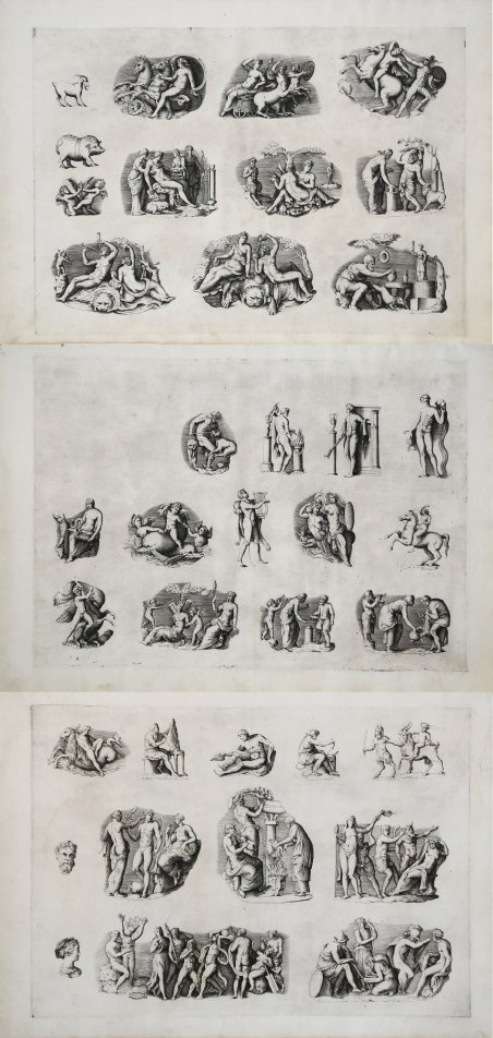 Serie completa di tre incisioni al bulino, circa 1550/55, prive di firma ed indicazioni editoriali. Le tavole, che riproducono una serie di gemme della collezione Grimani, sono attribuite dagli studiosi, a partire da Bartsch, al parmense Enea Vico. Anche Battista Franco realizzò delle incisioni (Bartsch XVI, p. 146, nn. 81-93) derivanti da queste gemme. Esemplari nel primo stato di tre per Rubach (primo di due per Alberti), avanti l’indirizzo di Claudio Duchetti. Rubach descrive anche la tiratura di Giovanni Orlandi del 1602. Non è dato sapere se il Vico incise le lastre su commissione del Lafreri o se le lastre furono acquistate in seguito dalla tipografia; figurano nell’Indice (1573, nn. 260-261) descritte come Tre tauole de diuersi intagli de Camelli fragmenti doue di uedono di molte sorte de sacrifitii & altre cose uarie. Possibile che la datazione risalga a dopo il 1551, quando la famiglia Grimani rientrò in possesso dei tesori che erano stati impegnati. Magnifiche prove, ricche di toni, impresse su carta vergata coeva con filigrana “cervo in uno scudo con croce” (su Huelsen 84, cfr. Woodward nn. 51-53) e “corona” (su Huelsen 85-86, cfr. Woodward nn. 259-261), con ampi margini, in perfetto stato di conservazione. “La prestigiosa Collezione Grimani apparve nell’opera Ex gemmis et cameis antiquorum aliquot monumenta. Le gemme furono confiscate da alcuni creditori a Marino Grimani per essere poi restituite, ad Orvieto, nel 1551 alla sua famiglia. L’incisione è attribuibile a Enea Vico per la curiosità con cui egli indagava le antichità romane, le statue, i dipinti, i sarcofagi, per non parlare dei suoi studi sulle medaglie pubblicati nel volume Le immagini con tutti i riversi trovati et le vite de gli Imperatori tratte dalle medaglie et dalle historie de gli antichi (1548). Ad uno studioso così attento non poteva sfuggire la rilevanza delle gemme intagliate e dei cammei antichi. Il Lafréry volle includere nello Speculum i disegni che ritraevano pezzi della Collezione” (cfr. Marigliani, ' Lo splendore di Roma nell’Arte incisoria del Cinquecento). Da queste tre tavole, Philippe Thomassin aveva ricavato, verso il 1618, trentatré piccole lastre (cfr. Grelle Iusco 1996, p. 384, n. 17-10). Le tavole appartengono allo ' Speculum Romanae Magnificentiae, la prima iconografia della Roma antica. ' Lo ' Speculum ' ebbe origine nelle attività editoriali di Antonio Salamanca e Antonio Lafreri (Lafrery). Durante la loro carriera editoriale romana, i due editori - che hanno lavorato insieme tra il 1553 e il 1563 - hanno avviato la produzione di stampe di architettura, statuaria e vedutistica della città legate alla Roma antica e moderna. Le stampe potevano essere acquistate individualmente da turisti e collezionisti, ma venivano anche acquistate in gruppi più grandi che erano spesso legati insieme in un album. Nel 1573, Lafreri commissionò a questo scopo un frontespizio, dove compare per la prima volta il titolo Speculum Romanae Magnificentiae. Alla morte di Lafreri, due terzi delle lastre di rame esistenti andarono alla famiglia Duchetti (Claudio e Stefano), mentre un altro terzo fu distribuito tra diversi editori. Claudio Duchetti continuò l’attività editoriale, implementando le lastre dello Speculum con copie di quelle “perdute” nella divisione ereditaria, che fece incidere al milanese Amborgio Brambilla. Alla morte di Claudio (1585) le lastre furono cedute – dopo un breve periodo di pubblicazione degli eredi, in particolare nella figura di Giacomo Gherardi - a Giovanni Orlandi, che nel 1614 vendette la sua tipografia al fiammingo Hendrick van Schoel. Stefano Duchetti, al contrario, cedette le proprie matrici all’editore Paolo Graziani, che si associò con Pietro de Nobili; il fondo confluì nella tipografia De Rossi passando per le mani di editori come Marcello Clodio, Claudio Arbotti e Giovan Battista de Cavalleris. Il restante terzo di matrici della divisione Lafreri fu sudd. Complete series of three engravings, circa 1550/55, lacking signature and editorial indications. The plates, which reproduce a series of gems from the Grimani collection, are attributed by scholars, starting with Bartsch, to Enea Vico from Parma. Battista Franco also produced engravings (Bartsch XVI, p. 146, nos. 81-93) derived from these gems. Examples in the first state of three for Rubach (first of two for Alberti), ahead of Claudio Duchetti's address. Rubach also describes Giovanni Orlandi's issue of 1602. It is not known whether Vico engraved the plates on Lafreri's commission or whether the plates were later acquired by the printer; they appear in the Index (1573, nos. 260-261) described as Tre tauole de diuersi intagli de Camelli fragmenti doue di uedono di molte sorte de sacrifitii & altre cose uarie. Possibly dated to after 1551, when the Grimani family regained possession of the treasures that had been pawned. Magnificent proofs, richly toned, imprinted on contemporary laid paper with watermarks "deer in a shield with cross" (on Huelsen 84, cf. Woodward nos. 51-53) and "crown" (on Huelsen 85-86, cf. Woodward nos. 259-261), with wide margins, in perfect condition. “The prestigious Grimani Collection appeared in the work Ex gemmis et cameis antiquorum aliquot monumenta. The gems were confiscated by some creditors from Marino Grimani only to be returned, in Orvieto, in 1551 to his family. The engraving is attributable to Enea Vico because of the curiosity with which he investigated Roman antiquities, statues, paintings, sarcophagi, not to mention his studies on medals published in the volume Le immagini con tutti i riversi trovati et le vite de gli Imperatori tratte dalle medaglie et dalle historie de gli antichi (1548). Such a careful scholar could not have missed the relevance of carved gems and ancient cameos" (translate from C. Marigliani, ' Lo splendore di Roma nell’Arte incisoria del Cinquecento). The work belongs to the Speculum Romanae Magnificentiae, the ear