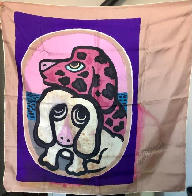 Edizioni Paolo Belforte, Livorno, 1964 circa. Litografia in colore su seta, cm 76 x 76 circa, tiratura di 300 esemplari e firma dell'Autore a penna sull'angolo in basso a destra dell'oggetto. Giuseppe Viviani (San Giuliano Terme, 1869 - Pisa, 1965) pittore e incisore italiano tra i maggiori del Novecento italiano accanto a Luigi Bartolini e Giorgio Morandi. Alcune visibili macchie del tempo ma colori ancora molto saturi e nitidi, firma ben leggibile.