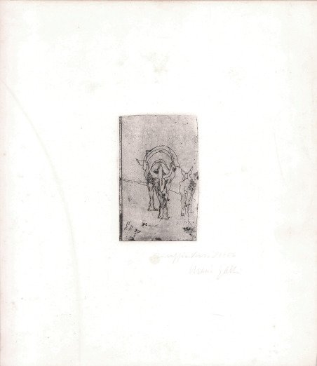 Acquaforte su lastra di zinco, misure: mm 113x70; foglio mm 320x280. Firmata in lastra in basso a sinistra “G. F.”, firmata e datata a matita in basso a destra … verso il 1906 Giovanni Fattori. Tiratura coeva (prima anni del XX secolo), impressione su carta chiara. Bellissima prova, lievissima gora nel margine bianco sinistro, in ottimo stato di conservazione. I Due somarelli ricalcano il tema della natura e degli animali legati al mondo del lavoro rurale, tanto caro al Fattori. Insolita la scelta dell’inquadratura, una ripresa da tergo, con lo spazio costruito con ampie zone di bianco: la scena è infatti quasi limitata ai contorni, priva di velature o effetti di inchiostro, con lastra molto ripulita e debole pressione del torchio. Sono inoltre evidenti alcuni danni sulla matrice. In un disegno a matita realizzato intorno al 1900 (Baboni-Malesci, p. 492, fig. 6) le figure ai lati corrispondono quasi esattamente ai due animali qui raffigurati. La data a matita di questo esemplare, ricolloca questa incisione al 1906 circa. Giovanni Fattori, pittore e incisore, viene soprattutto ricordato come uno dei principali esponenti del movimento dei Macchiaioli e come artista di spicco nel panorama ottocentesco, nonché come prolifico incisore dal segno vivace e del tutto personale. Fattori era solito stampare da sé i suoi lavori utilizzando un piccolo torchio, esegue tirature irregolari spesso contraddistinte da una ricerca per gli effetti di chiaroscuro e da un uso sapiente delle velature. Gli esemplari di una stessa lastra sono perciò spesso differenti, più carichi e attenti agli effetti di luce nelle tirature curate dall’autore, meno caldi e più nitidi quelli fatti stampare presso la Calcografia. Il ritratto, i soggetti militari, testimonianza dell’interesse verso i fatti risorgimentali, gli animali della campagna e gli scorci di vita comune sono i soggetti che più lo impegnano. Bibliografia Rudy Chiappini, Giovanni Fattori, Museo d'Arte Moderna, Città di Lugano; Milano: Skira, 2003, ' n. 6. ' Etching on zinc plate, dimensions: mm 113 x 70; sheet mm 320x 280. Signed in plate at lower left "G. F.", signed and dated in pencil at lower right . circa 1906 Giovanni Fattori. Contemporary early issue, 1906 circa, impression on white paper. Beautiful proof, very slight water stain in left white margin, in very good condition. The Two Donkeys traces the theme of nature and animals related to the world of rural labor, so close to Fattori. Unusual is the choice of framing, a shot from the back, with the space built up with large areas of white: the scene is in fact almost limited to outlines, free of glazing or ink effects, with very clean plate and weak press pressure. Some damage on the matrix is also evident. In a pencil drawing made around 1900 (Baboni-Malesci, p. 492, fig. 6) the figures on the sides correspond almost exactly to the two animals depicted here. The date in pencil on this example, places this engraving back to about 1906. Giovanni Fattori, a painter and engraver, is mainly remembered as one of the leading exponents of the Macchiaioli movement and as a prominent artist in the 19th-century scene, as well as a prolific engraver with a lively and wholly personal sign. Fattori used to print his works himself using a small press, executing irregular print often marked by a search for chiaroscuro effects and a skillful use of glazing. The examples of the same plate are therefore often different, more loaded and attentive to the effects of light in the prints taken care of by the author, less warm and sharper those made printed at the Calcografia. Portraiture, military subjects, evidence of his interest in Risorgimento events, animals of the countryside and glimpses of common life are the subjects that engage him most. Bibliografia Rudy Chiappini, Giovanni Fattori, Museo d'Arte Moderna, Città di Lugano; Milano: Skira, 2003, ' n. 6. Cfr.