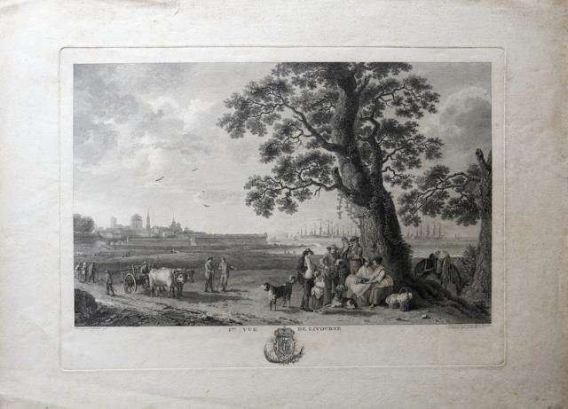 1790 circa. Incisione in rame all'acquaforte, b/n, cm 35 x 48,5 (alla lastra) più ampi margini. Da un dipinto del 1778 dell'Hackert (Prezlau, 1737 – Firenze, 1807), incisa dal Duncker (Strauslund 1746 – Berna, 1807), bella veduta di invenzione che raffigura una parte della città di Livorno ripresa da una zona limitrofa e agreste. Scena animata da numerose figure di popolani all'ombra di un albero, animali e buoi al giogo; la fortezza vecchia con uno scorcio prospettico che include numerose architetture, si profila sulla sinistra, le imbarcazioni in lontananza sono disposte in modo molto preciso e parallelo. Un leggero foxing marginale, buon esemplare ben impresso e in margini.