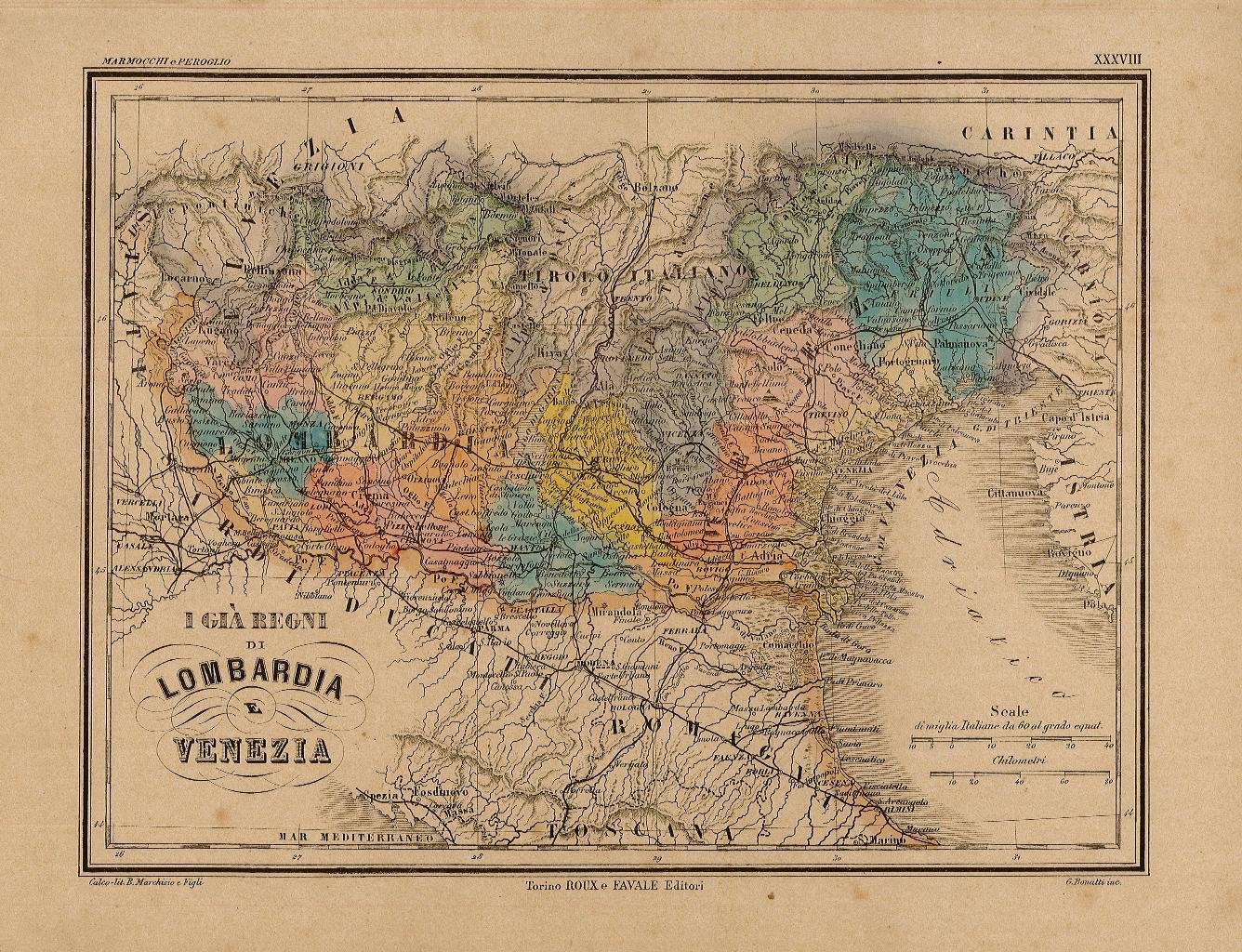 Carta geografica in litografia, antica ed originale del 1878, di mm 240x340 (il foglio) con coloritura coeva. Stampata dalla calco-litografia di B. Marchisio & Figli ed inserita nell'opera a cura del Cavaliere Celestino Peroglio raffigurante la Lombardia e Veneto