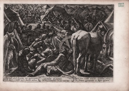 Acquaforte, circa 1613, monogrammata e numerata in lastra. Della serie "Sacra Bella Sanctae Veterum Bibliorum Historiae".Magnifica prova, particolarmente nitida e ricca di toni, impressa su carta vergata coeva, con margini oltre l’impronta del rame, in eccellente stato di conservazione. La tavola appartiene alla serie di 25 incisioni (numerate 1-24 più il frontespizio) che raffigurano scene con battaglie del Vecchio Testamento, stampate a Roma da Nicolas van Aelst nel 1613.Il frontespizio riporta la data e i dettagli editoriali "Nicolaus Van Aelst Formis" e "Romae superiorum permissum", oltre alla dedica di Tempesta a Cosimo II: "Serenissimo principi Cosmo II magno hetruriae duci Antonius Tempesta felicitatem". Etching, circa 1613, from the series "Sacra Bella Sanctae Veterum Bibliorum Historiae". Magnificent proof, with very good contrast and rich tonalities, printed on contemporary laid paper, margins extending beyond the platemark, in excellent conditions.Parte of the series of 25 prints numbered 1 to 24 plus frontispiece, depicting scenes from the Old Testament.The title page, is dated and lettered within image with publication detail: "Nicolaus Van Aelst Formis" and "Romae superiorum permissum" and with Latin dedication to Cosimo II and production detail beginning "Serenissimo principi Cosmo II magno hetruriae duci Antonius Tempesta felicitatem". Cfr. Bartsch XVII.129.249.