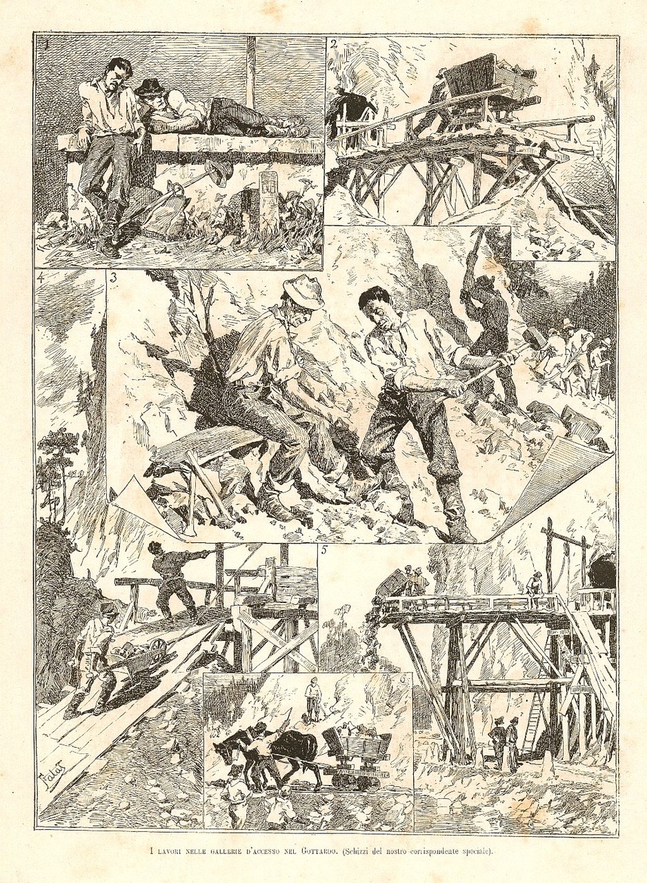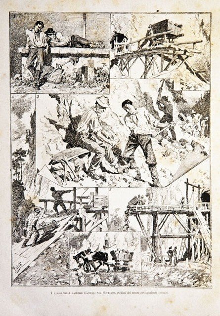 Stampa, antica ed originale, raffigurante alcuni momenti dei lavori nelle gallerie del Gottardo. Testo al retro