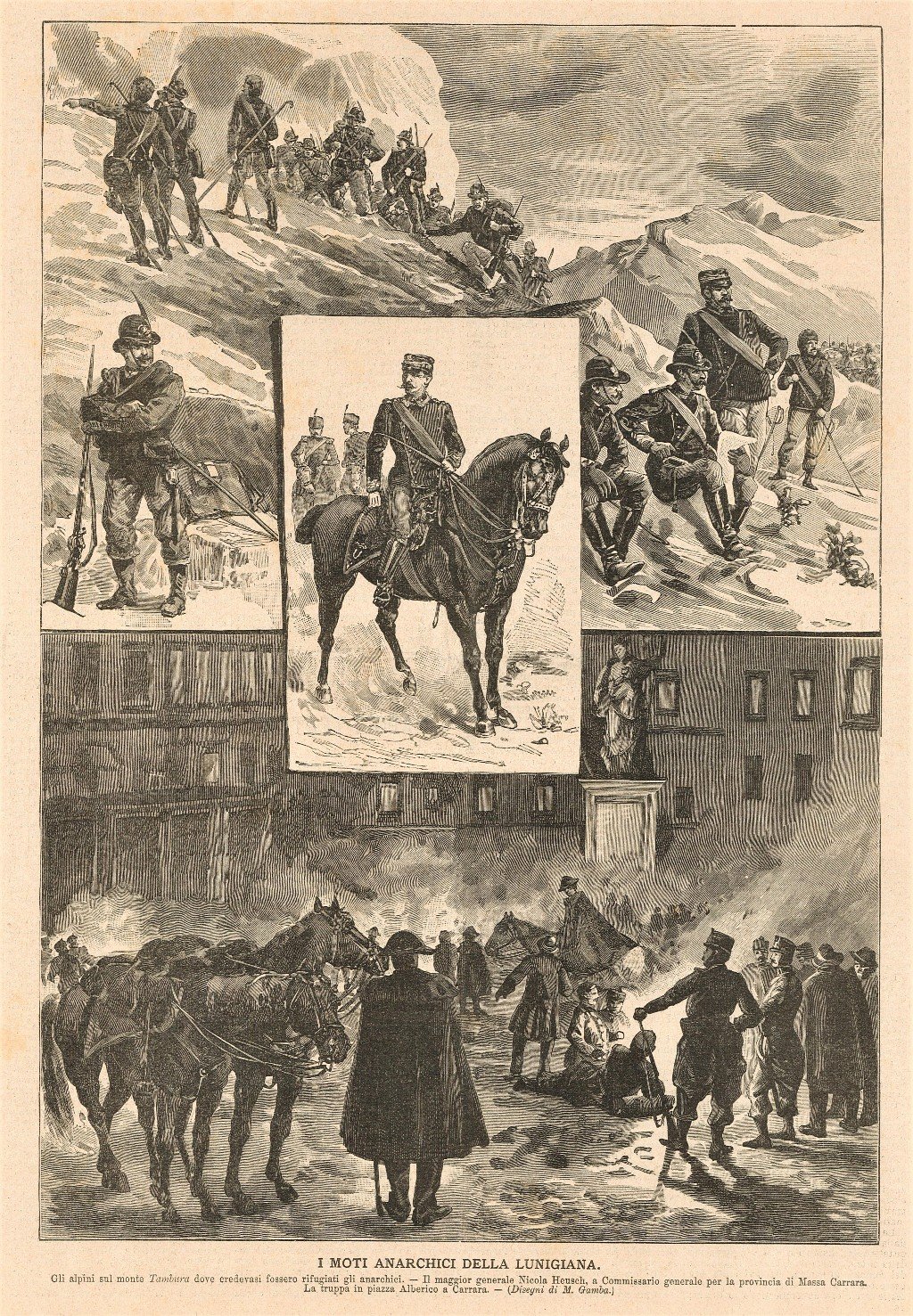 Raffigurazione dei moti nella Lunigiana: gli alpini sul Monte Tambura alla ricerca di anarchici e le truppe in piazza Alberico a Carrara. Testo al verso, pieghe