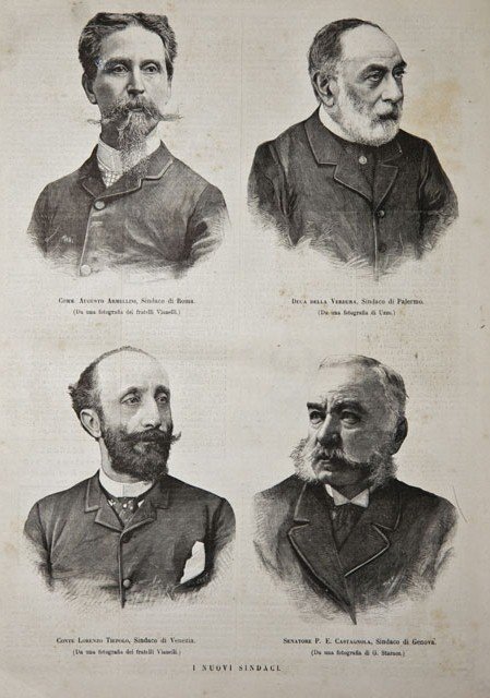 Ritratti di quattro sindaci italiani: Augusto Armellini sindaco di Roma, Giulio Benso Sammartino Duca della Verdura sindaco di Palermo, Lorenzo Tiepolo sindaco di Venezia e Stefano Castagnola sindaco di Genova. Testo al verso