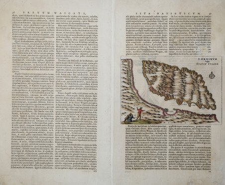 Rara mappa dell'isola di Vaiga? (Staten Eyland), pubblicata solo nell'Atlas Maior di Johannes Blaeu. Mostra le numerose catene montuose e un lago all'interno dell'isola; diverse baie sono notate insieme a zone di possibile ancoraggio. In basso a sinistra una scena raffigura due esploratori olandesi che vengono attaccati da un orso. La mappa è inserita all'interno di una pagina di testo latino, che continua sul verso. L'isola Vaiga? è un'isola tra il mare di Kara e il mare della Pe?ora. L’'isola si trova tra il continente e l'isola Južnyj della Novaja Zemlja. È separata dalla terraferma dallo stretto di Jugor e da Južnyj dallo stretto di Kara. These scarce maps of Vaygach Island (Staten Eyland) were only published in Johannes Blaeu's Atlas Maior. ' This map of Staten Eyland is more of a terrestrial map showing numerous mountain ranges and a lake within the island. Several bays are noted along with areas of possible anchorage. In the lower left a scene depicts two Dutch explorers being attacked by a bear. The map is displayed within a page of Latin text, which continues on the verso. Vaygach Island is an island in the Arctic Sea between the Pechora Sea and the Kara Sea. Vaygach Island is separated from the Yugorsky Peninsula in the mainland by the Yugorsky Strait and from Novaya Zemlya by the Kara Strait. Cfr.