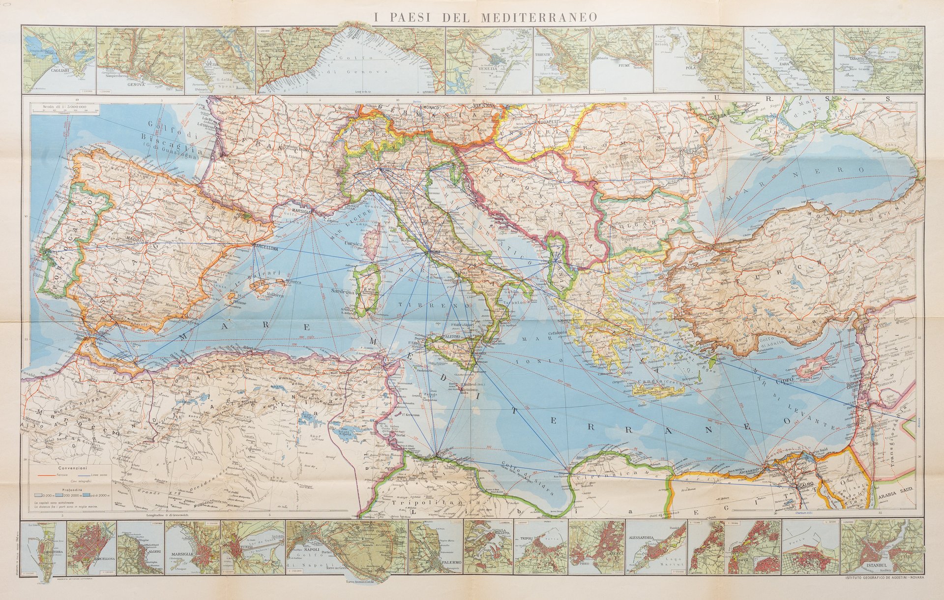 Stampa in offset, mm 530x870. Non comune mappa di grande format del Mediterraneo con piante delle maggiori città e riquadri dettagliati di alcune regioni. Perfetto esemplare con usuali trace delle pieghe editoriali.<BR>