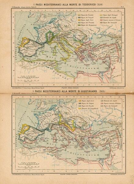 Carta geografica originale, con piega centrale editoriale, raffigurante i paisi mediterranei alla morte di Teodorico nel 526 d.c. e quella di Giustiniano 565 d.c.