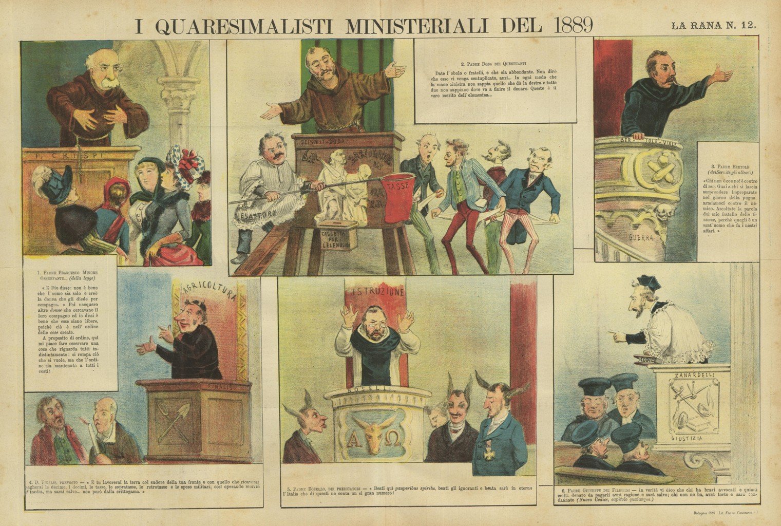 Litografia, antica ed originale, stampata a colori, con raffiguranti in sei vignette i vari predicatori: Crispi, Padre Doda Padre Bertolè, Padre Francesco Minore, Padre Bosello e Padre Giuseppe dei Filippini. Tratta dal ricercato e raro giornale umoristico settimanale LA RANA, fondato a Bologna nel novembre 1865 da Leonida Gioannetti e da Augusto Grossi. Fu un giornale di grande successo per le sue satiriche caricature a colori di cui alcune in qudruplo foglio che fu uno dei successi editoriali. I politici, lo Stato Ecclesiastico e la politica europea furono i prediletti ispiratori. Il periodico affrontò una grave crisi nel 1873, quando Grossi decise di abbandonare la redazione per fondare Il Papagallo. La Rana sospese le pubblicazioni nel 1911, per cessarle definitivamente nel 1912.