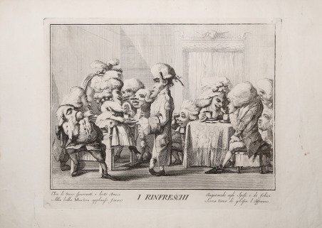 Acquaforte, 1791/95, priva di firma ed indicazioni editoriali. Da un soggetto di Giuseppe Piattoli. Bellissima prova, impressa su carta coeva, con margini, in ottimo stato di conservazione. Tavola della serie ' Lo Sposalizio di Marfisa, una serie di 10 opere incise da Carlo Lasinio su disegno di Giuseppe Piattoli e pubblicate a Firenze dalla tipografia di Niccolò Pagni e Giuseppe Bardi. Per la datazione delle stampe, sia Lazzaro che Scrase - analizzando gli esemplari conservati al Cantor Arts Center - propongono il 1790 basandosi, forse, sulla data della tavola intitolata “La buona notte”, l’unica in cui l’ultima cifra sembra essere uno zero. Tuttavia, l’assenza della serie di Marfisa nell’elenco delle opere in vendita in un altro ' Catalogo delle stampe incise in rame che si vendono in Firenze da Niccolò Pagni, e Giuseppe Bardi ' stampato a Firenze dopo il 1791, avvalora l’ipotesi di una datazione seguente a questa data poiché risulterebbe inconsueta la mancata promozione di una raccolta edita soltanto l’anno precedente. In un successivo catalogo della tipografia conservato nella Raccolta Bertarelli, troviamo citato “Lo sposalizio di Marfisa, o sia raccolta di Caricature diverse inventate da Giuseppe Piattoli in Num. 10 mezzi fogli imperiali, ed espresse a colori. Paoli 15”. Le dieci incisioni - mai rilegate e prive di frontespizio - accompagnate da iscrizioni di titolazione e documentarie, costituiscono un vero e proprio poemetto figurato con i momenti chiave che preludono a un matrimonio alla moda settecentesca, i cui eleganti versi stridono, volutamente, con i personaggi grotteschi ai quali si riferiscono, accentuandone il carattere ridicolo. La vasta letteratura satirica e burlesca di tradizione toscana, insieme alle poesie e canzoni popolari, ispirano certamente il Piattoli, al quale doveva essere nota la produzione del poeta Francesco Berni, vissuto due secoli prima, dal quale deriva il termine “bernesco” per definire un vero e proprio genere letterario, che ebbe numerosi imitatori e influenzerà anche la pittura caricaturale a cavallo tra Sei e Settecento. Altra fonte di ispirazione, fu il poema eroicomico, intitolato ' La Marfisa Bizzarra, composto da Carlo Gozzi tra il 1761 e il 1768, il quale offre al pubblico una stravagante versione del mondo epico-cavalleresco. Per quanto riguarda, invece, le fonti grafiche e pittoriche utilizzate dall’artista se ne possono suggerire molteplici e di diversa provenienza: quella anglosassone - soprattutto la famosa serie realizzata da William Hogarth, tra il 1743 e il 1745, dal titolo ' Mariage à la mode; quella veneta - motivi satirici e scherzosi del costume veneziano caratterizzano le incisioni di Giandomenico Tiepolo, che ritraggono scene di vita quotidiana; quella romana, dove l’abbondante produzione caricaturale di Pier Leone Ghezzi era all’epoca tra le più diffuse, e non ultima la tradizione toscana, i cui personaggi deformi saranno tra i soggetti preferiti della pittura di genere dal Cinquecento al Settecento. Sarà però l’incisore lorenese Jacques Callot, arrivato nel 1611 a Firenze, a creare con i suoi ‘Gobbi’ una tipologia caricaturale che influenzerà non solo le opere di artisti a lui coevi come Stefano Della Bella e Baccio del Bianco, ma anche quelle del bresciano Faustino Bocchi e di Giovanni Domenico Ferretti, rievocanti in alcuni tratti le affascinanti grottesche di Gaetano Piccini, i cui personaggi - i cosiddetti caramogi - sono gli stessi che popolano ' Lo Sposalizio di Marfisa. Piattoli attinge, dunque, a piene mani da questi repertori traendo ispirazione soprattutto dai disegni di Baccio, nonostante siano tra quelli meno conosciuti poiché non tradotti in incisione. Per il Piattoli le ‘Nozze di Marfisa’ non sono altro che il pretesto per deridere benevolmente l’ingenuo e coinvolgente sentimento amoroso della fanciulla desiderosa di percorrere tutte le fasi convenzionali che preludono al matrimonio, a cominc. Etching, 1791/95, unsigned and without printing details. From a subject by Giuseppe Piattoli. Beautiful proof, impressed on contemporary wove paper, with margins, in excellent condition. Plate from the series ' Lo Sposalizio di Marfisa, a series of 10 works engraved by Carlo Lasinio from a drawing by Giuseppe Piattoli and published in Florence by the printing house of Niccolò Pagni and Giuseppe Bardi. For the dating of the prints, both Lazarus and Scrase -analyzing the examples preserved at the Cantor Arts Center - propose 1790 based, perhaps, on the date of the panel titled "La buona notte," the only one in which the last figure appears to be a zero. However, the absence of the Marfisa series in the list of works for sale in another ' Catalogo delle stampe incise in copperplate che si vendono in Firenze da Niccolò Pagni, e Giuseppe Bardi ' printed in Florence after 1791, supports the hypothesis of a dating after this date since it would be unusual for a collection published only the previous year not to be promoted. ' In a later catalog of the printer preserved in the Bertarelli Collection, we find the series listed as "Lo sposalizio di Marfisa, o sia raccolta di Caricature diverse inventate da Giuseppe Piattoli in Num. 10 mezzo fogli imperiali, ed espresse a colori. ' 15 Pauls." The ten engravings, lacking a frontispiece, constitute a veritable figurative poem with the key moments that prelude an eighteenth-century fashionable wedding, whose elegant verses deliberately clash with the grotesque characters to whom they refer, accentuating their ridiculous character. The vast satirical and burlesque literature of the Tuscan tradition, together with popular poems and songs, certainly inspired Piattoli, to whom the production of the poet Francesco Berni, who had lived two centuries earlier, must have been familiar, from whom the term "bernesco" was derived to define a true literary genre, which had numerous imitators and would also influence caricature painting at the tur