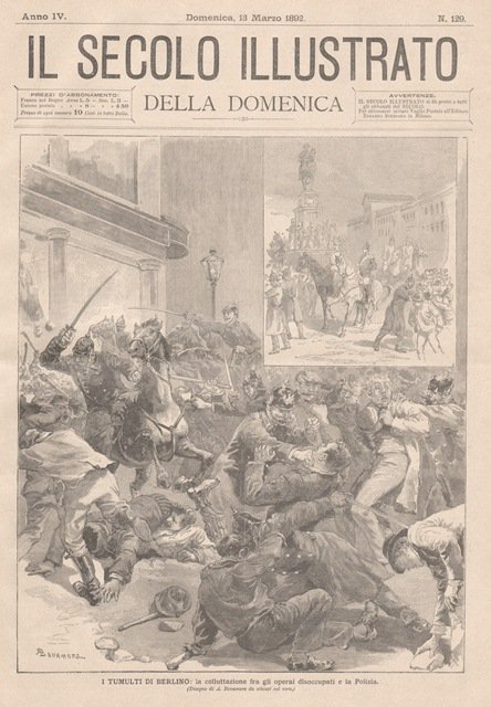 Due scene mostrano disoccupati contro le forze dell’ordine nelle vie di Berlino la sera del 25 febbraio 1892. Testo al retro