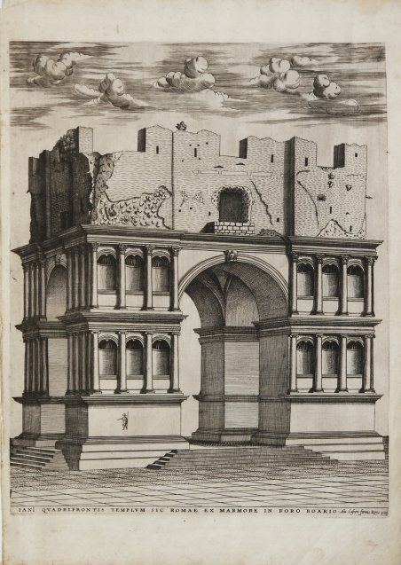Bulino, 1564, firmato e datato in basso a sinistra: «Ant. Lafreri formis, Romæ 1564». Esemplare nel primo stato di due descritto da Rubach, avanti l’indirizzo di Nicolas van Aelst. Magnifica prova, impressa su carta vergata coeva con filigrana “aquila nel cerchio con corona” (cfr. Woodward nn. 55-75), con margini, in eccellente stato di conservazione. La tavola deriva dall’analoga incisione pubblicata da Tommaso Barlacchi nel 1550: https://www.antiquarius.it/it/lafreri-speculum-romanae-magnificentiae/13909-arco-di-giano.html Iscritto in basso al centro: «IANI QVADRIFRONTIS · SIC ROMAE EX MARMORE IN FORO BOARIO» [Tempio di Giano bifronte, così a Roma nel foro boario]. L’arco fu fatto erigere nel quarto secolo d.C. da Costantino, o più probabilmente da Costanzo II, presso il Tevere, nell’antico mercato del bestiame o Foro Boario. Il grande arco a quattro facciate è in muratura rivestita di lastre di marmo, con nicchie ricavate per accogliere altrettante statue. «Ha quattro aperture come dimostra la pianta qui sotto, e fra l’un pilastro e l’altro sono palmi XXII. Intorno questo portico ci sono XVIII, nicchi, nódimeno ce ne sono solamente XVI, per locare statue, tutti gli altri sono finti, cioè poco cauati nel muro, i quali nicchi erano ornati di colonnelle di basso rilievo per quanto si comprende, & erano di ordine Ionico, ma è tutto spogliato di tali ornamenti» (Sebastiano Serlio, 1567). L’attico che si vede nella stampa del Lafreri fu demolito nel 1827 perché ritenuto di epoca successiva. L’opera appartiene allo Speculum Romanae Magnificentiae, la prima iconografia della Roma antica. La lastra figura nell'Indice del Lafreri al n. 116, descritta come Il tempio di Ianni. Lo ' Speculum ' ebbe origine nelle attività editoriali di Antonio Salamanca e Antonio Lafreri (Lafrery). Durante la loro carriera editoriale romana, i due editori - che hanno lavorato insieme tra il 1553 e il 1563 - hanno avviato la produzione di stampe di architettura, statuaria e vedutistica della città legate alla Roma antica e moderna. Le stampe potevano essere acquistate individualmente da turisti e collezionisti, ma venivano anche acquistate in gruppi più grandi che erano spesso legati insieme in un album. Nel 1573, Lafreri commissionò a questo scopo un frontespizio, dove compare per la prima volta il titolo Speculum Romanae Magnificentiae. Alla morte di Lafreri, due terzi delle lastre di rame esistenti andarono alla famiglia Duchetti (Claudio e Stefano), mentre un altro terzo fu distribuito tra diversi editori. Claudio Duchetti continuò l’attività editoriale, implementando le lastre dello Speculum con copie di quelle “perdute” nella divisione ereditaria, che fece incidere al milanese Amborgio Brambilla. Alla morte di Claudio (1585) le lastre furono cedute – dopo un breve periodo di pubblicazione degli eredi, in particolare nella figura di Giacomo Gherardi - a Giovanni Orlandi, che nel 1614 vendette la sua tipografia al fiammingo Hendrick van Schoel. Stefano Duchetti, al contrario, cedette le proprie matrici all’editore Paolo Graziani, che si associò con Pietro de Nobili; il fondo confluì nella tipografia De Rossi passando per le mani di editori come Marcello Clodio, Claudio Arbotti e Giovan Battista de Cavalleris. Il restante terzo di matrici della divisione Lafreri fu suddiviso e scisso tra diversi editori, in parte anche francesi: curioso vedere come alcune tavole vengano ristampate a Parigi da Francois Jollain alla metà del XVII secolo. Diverso percorso ebbero alcune lastre stampate da Antonio Salamanca nel suo primo periodo; attraverso il figlio Francesco, confluirono nella tipografia romana di Nicolas van Aelst. Altri editori che contribuirono allo Speculum furono i fratelli Michele e Francesco Tramezzino (autori di numerose lastre che confluirono in parte nella tipografia Lafreri), Tommaso Barlacchi, e Mario Cartaro, che fu l’esecutore testamentario del Lafreri, e stampò alcune . Engraving, 1564, signed and dated lower left: "Ant. Lafreri formis, Romæ 1564". Example in the first state of two described by Rubach, before Nicolas van Aelst's address. Magnificent proof, printed on contemporary laid paper with watermark "eagle in circle with crown" (see Woodward nos. 55-75), with margins, in excellent condition. The plate is derived from the similar engraving published by Tommaso Barlacchi in 1550: https://www.antiquarius.it/it/lafreri-speculum-romanae-magnificentiae/13909-arco-di-giano.html Inscribed in the lower center: "IANI QVADRIFRONTIS - SIC ROMAE EX MARMORE IN FORO BOARIO" “The arch was erected in the fourth century AD by Constantine, or more likely by Constantius II, near the Tiber, in the ancient cattle market or Foro Boario. The large four-sided arch is of masonry covered with marble slabs, with niches carved out to accommodate as many statues. «Ha quattro aperture come dimostra la pianta qui sotto, e fra l’un pilastro e l’altro sono palmi XXII. Intorno questo portico ci sono XVIII, nicchi, nódimeno ce ne sono solamente XVI, per locare statue, tutti gli altri sono finti, cioè poco cauati nel muro, i quali nicchi erano ornati di colonnelle di basso rilievo per quanto si comprende, & erano di ordine Ionico, ma è tutto spogliato di tali ornamenti» (Sebastiano Serlio, 1567). The attic seen in Lafreri's print was demolished in 1827 because it was believed to be of later date. (translation from C. Marigliani, ' Lo splendore di Roma nell’Arte incisoria del Cinquecento). The work belongs to the Speculum Romanae Magnificentiae, the earliest iconography of ancient Rome. The Speculum originated in the publishing activities of Antonio Salamanca and Antonio Lafreri (Lafrery). During their Roman publishing careers, the two editors-who worked together between 1553 and 1563-started the production of prints of architecture, statuary, and city views related to ancient and modern Rome. The prints could be purchased individually by tourists and collectors,