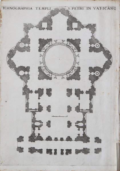 Pianta della Basilica di San Pietro. In alto l'iscrizione in latino: "Ichnographia Templi S. Petri in Vaticano". Acquaforte, stampata su carta vergata coeva, buone condizioni. Poco si sa di Regnard, se non che fu un incisore francese che trascorse gran parte della sua vita lavorativa a Roma realizzando belle incisioni dei magnifici edifici e delle antichità. Quest'opera di Regnard fu pubblicata a Roma da Francois Collignon nel 1650, senza titolo, ma in un insieme noto come ' Praecipua urbis templa. Le tavole mostrano prospetti, sezioni e piante di chiese romane del XVI e XVII secolo, con didascalie che le identificano e i loro architetti (con occasionali attribuzioni errate). Includono lavori di Carlo Maderno, G. della Porta, F. da Volterra, la famiglia Longhi, G.B. Soria e molti altri. Rara. Basilica di San Pietro. Above the inscription in Latin: "Ichnographia Templi S. Petri in Vaticano". Etching, printed on contemporary laid paper, good condition. Little is known about Regnard, except that he was a French engraver who spent much of his working life in Rome making fine engravings of the magnificent buildings and antiquities. This work by Regnard was published in Rome by Francois Collignon in 1650, without a title, but in a set known as ' Praecipua urbis templa. The plates show elevations, sections and plans of 16th- and 17th-century Roman churches, with captions identifying them and their architects (with occasional misattributions). They include work by Carlo Maderno, G. della Porta, F. da Volterra, the Longhi family, G.B. Soria and many others. Rare. Cfr.