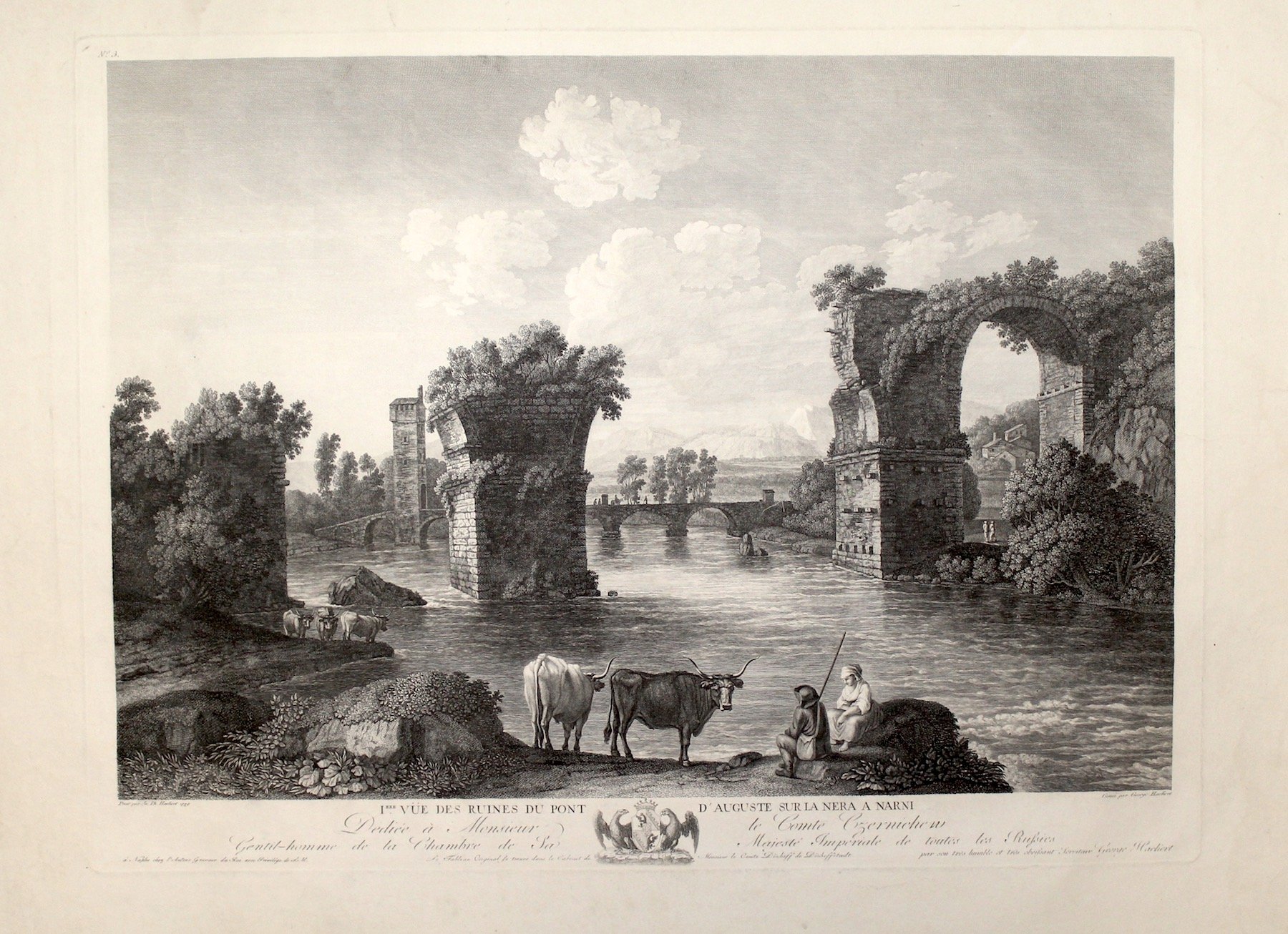 Incisione all'acquaforte di mm 430x575 intagliata da Gorge Hackert su dipinto dell'autore. Bella veduta della località umbra con pittoresca riproduzione delle rovine del Ponte di Augusto. Philipp Jakob Hackert (1737-1807), di nazionalità tedesca, compì fin da giovanissimo numerosi viaggi in Italia e si stabilì definitivamente a Roma nel 1768. Divenne pittore di corte del re di Napoli, e nel 1780 realizzò il famoso ciclo di dipinti "Dieci vedute della casa di campagna di Orazio". Celebri le pitture raffiguranti Caserta e la sua reggia. Bell' esemplare con due minimi strappetti all'estremità del margine bianco superiore. <BR>