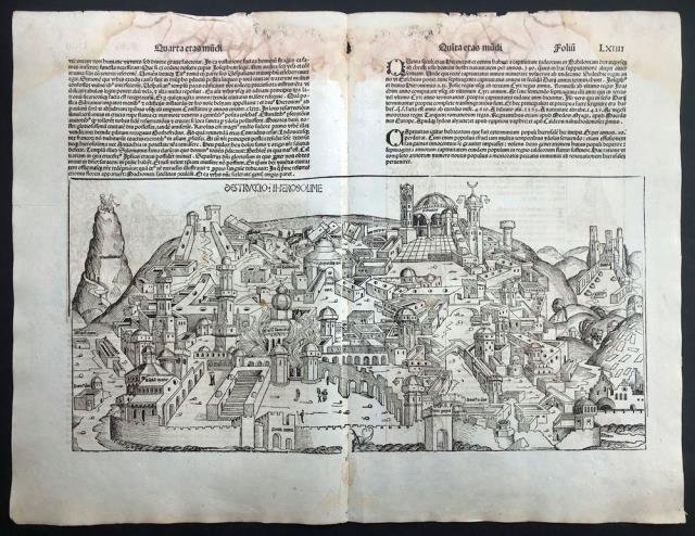 Dal “Liber Chronicarum Nurembergensi”, Norimberga, 1493. Fogli LXIII e LXIIII. Xilografia stampata su doppia pagina, b/n, cm 47,5 x 62 circa (il foglio). Su una metà, al recto della pagina LXIII, è incisa la xilografia con la scena dell'eccidio di Gerusalemme, il “Hierosolimorum excidium”; al verso del foglio LXIIII sono incise figure di profeti, pontefici e sibille. All'interno di questi due fogli numerati si trova la veduta di Gerusalemme. A proposito di questa veduta il Kreuer nota come il foglio, che mostra la distruzione della città di Gerusalemme, abbia rapporti con la veduta dettagliata della città presente nell'epitaffio di Adelheid Tucher, stampato a Norimberga nel 1483 e realizzato dal maestro dell'altar maggiore di Hersbrucker, per l'installazione nella chiesa di San Giacomo a Bamberga; ancora, almeno per quanto riguarda le annotazioni topografiche, che rimandi alla rappresentazione della città presente nella mappa della Palestina titolata “Peregrinatio Terram Sanctam”, realizzata E. Reuwichs, nel volume di B. Breydenbach del 1486; e ancora, per quanto riguarda la fonte per l'illustrazione e l'etichettatura, che abbia un legame con l'opera di Giuseppe Flavio, dal titolo “Le guerre giudaiche”, e in particolare con i volumi V e VI (Schedel nel foglio 63 della Cronaca afferma esplicitamente: “se vuoi sapere tutto, leggi Josephum”). La xilografia offre una delle vedute più antiche della città di Gerusalemme e l'unica veduta di grande formato del XV secolo. Foglio interessato da presenza rosso - violastra, il cosiddetto fungo rosso, ma al solo margine superiore, peraltro ben impresso e in buono stato di conservazione.