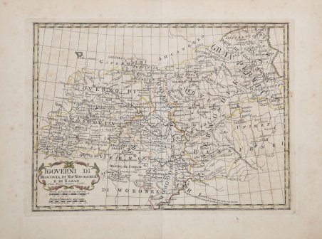 Carta tratta dalla rara raccolta di carte geografiche denominata Atlante Geografico, prima stesura delle opera dell’abate Bartolomeo Borghi, pubblicata in Siena dal Pazzini Carli. Molte delle carte, datate tra il 1788 ed il 1800, sono incise da Agostino Costa e poi successivamente inserite nell’opera Atlante generale dell'ab. Bartolommeo Borghi, pubblicato a Firenze nel 1819.Bartolomeo Borghi, che Vermiglioli (Biografia degli scrittori perugini, 1829) definisce "uno dei migliori geografi dell'Europa", nacque nel 1750 a Monte del Lago, piccola frazione del comune di Magione, in provincia di Perugia, sulle rive del Trasimeno. Ordinato sacerdote nel 1774, trascorse i primi anni del suo mandato nel paese natale, poi a Magione e quindi a Sorbello (Cortona).Appassionato studioso di geografia, applicò dapprima le sue conoscenze all'analisi delle terre a lui più familiari: nel 1770 scrisse Descrizione geografica, fisica e naturale del Lago Trasimeno (che sarà tuttavia data alle stampe per la prima volta solo nel 1821), e nel 1791 pubblicò negli atti dell'Accademia etrusca di Cortona una Dissertazione sopra l'antica geografia dell'Etruria, Umbria e Piceno, arricchendo entrambe le opere di una carta delle regioni descritte. Intanto la sua fama di cartografo, oltre che di geografo, cresceva, tanto da fargli ottenere le nomine a membro delle Accademie Cortonese e Reale di Firenze, e procurargli l'incarico, da parte di Pietro Leopoldo, di delineare la carta del catasto pubblico di Cortona e del contado di Castiglione.Nello stesso tempo gli orizzonti geografici della sua attività si allargavano sensibilmente, e se nell'Atlante Novissimo, illustrato ed accresciuto sulle osservazioni, e scoperte fatte dai più celebri e più recenti cartografi di Antonio Zatta (Venezia 1779-1785) il suo contributo fu ancora legato all'area toscana, nell'Atlante geografico che si pubblicò a Siena da Pazzini Carli tra il 1798 ed il 1800 il Borghi tracciò la maggior parte delle carte e spaziò dalle province del Sud-Est dell'Inghilterra, al Regno di Danimarca, alla Romania.Una sorta di prova generale, quest'ultima, della sua opera più importante, quell'Atlante generale dell'ab. Bartolommeo Borghi, pubblicato a Firenze nel 1819. L'Atlante, corredato da brevi descrizioni storiche, politiche, civili e naturali che introducono le carte relative ai territori afferenti a ciascun Impero o Regno illustrato, rispecchia il nuovo assetto geo-politico attuato dal Congresso di Vienna. Incisione in rame, in buone condizioni. Map taken form the very rare Atlante Geografico, the first draft of the abbot Bartolomeo Borghi, published in Siena by Pazzini Carli. Many of the mapss, dated between 1788 and 1800, are engraved by Agostino Costa and then later incorporated in the work of AB Atlante Generale di Bartolomeo Borghi, published in Florence in 1819.Bartolomeo Borghi, who Vermiglioli (Biography of writers Perugini, 1829) calls "one of the best geographers of Europe", was born in 1750 in Monte del Lago, a small fraction of the town of Mansfield, in the province of Perugia, on the shores of Lake Trasimeno. Ordained in 1774, spent the first years of his term in his hometown, then to Mansfield and then Sorbello (Cortona).A passionate student of geography, first applied his knowledge to the analysis of land more familiar to him: he wrote in 1770 Description geographical, physical and natural Lake Trasimeno (which will however be given to the press for the first time only in 1821), and 1791 published in the Proceedings of Etruscan Cortona a dissertation on the geography of ancient Etruria, Umbria and Piceno, enriching both the works of a map of the regions described. Meanwhile, his fame as a cartographer, as well as a geographer, was growing, so that he get the nomination as a member of the Royal Academies of Florence and Cortona, and give him the job, by Pietro Leopoldo, to outline the paper's public land Cortona and the county of Castiglione.At the same time the geographical horizons of its activities widened considerably, and if in the Atlas Novissimo, illustrated and amplified the observations and discoveries made by the most recent and most famous cartographer Antonio Zatta (Venice 1779-1785) his contribution was still related area of Tuscany, in the Atlas geographic monthly published in Siena by Pazzini Carli between 1798 and 1800 the villages drew most of the cards and spaced from the provinces of South-East of England, the Kingdom of Denmark, Romania.A sort of dress rehearsal, the latter, his most important work, quell'Atlante General of AB. Bartolomeo Borghi, published in Florence in 1819. The Atlas, accompanied by brief descriptions of historical, political, civil and natural to introduce the papers relating to the territories belonging to each United Empire or illustrated, reflects the new geo-political structure implemented by the Congress of Vienna. Cfr.
