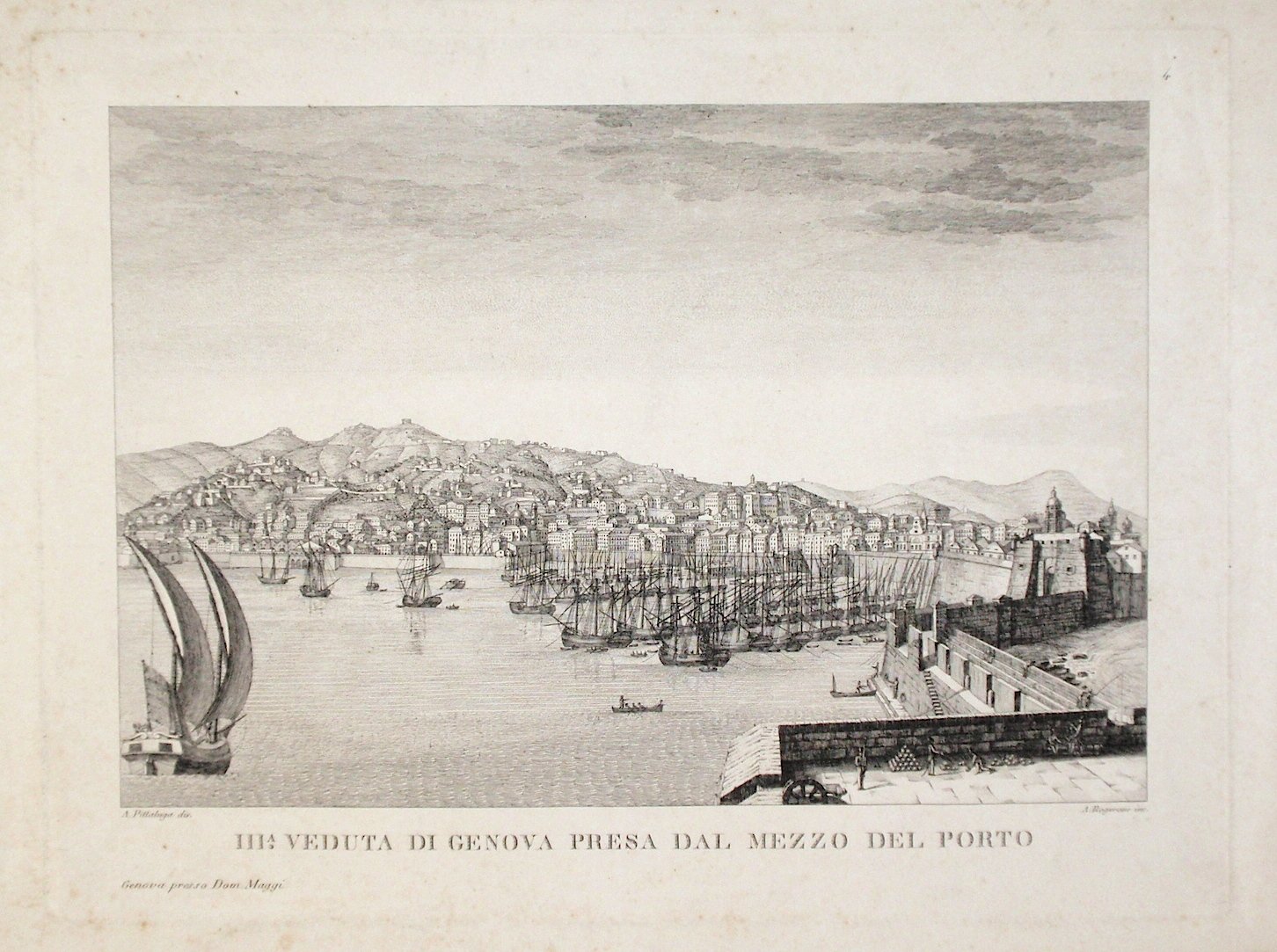 Incisione in rame di mm 260x355, tratta dalla serie delle vedute di Genova stampate da Domenico Maggi. Buone condizioni, con leggere fioriture della carta. Due piccoli strappi al margine sinistro. <BR>