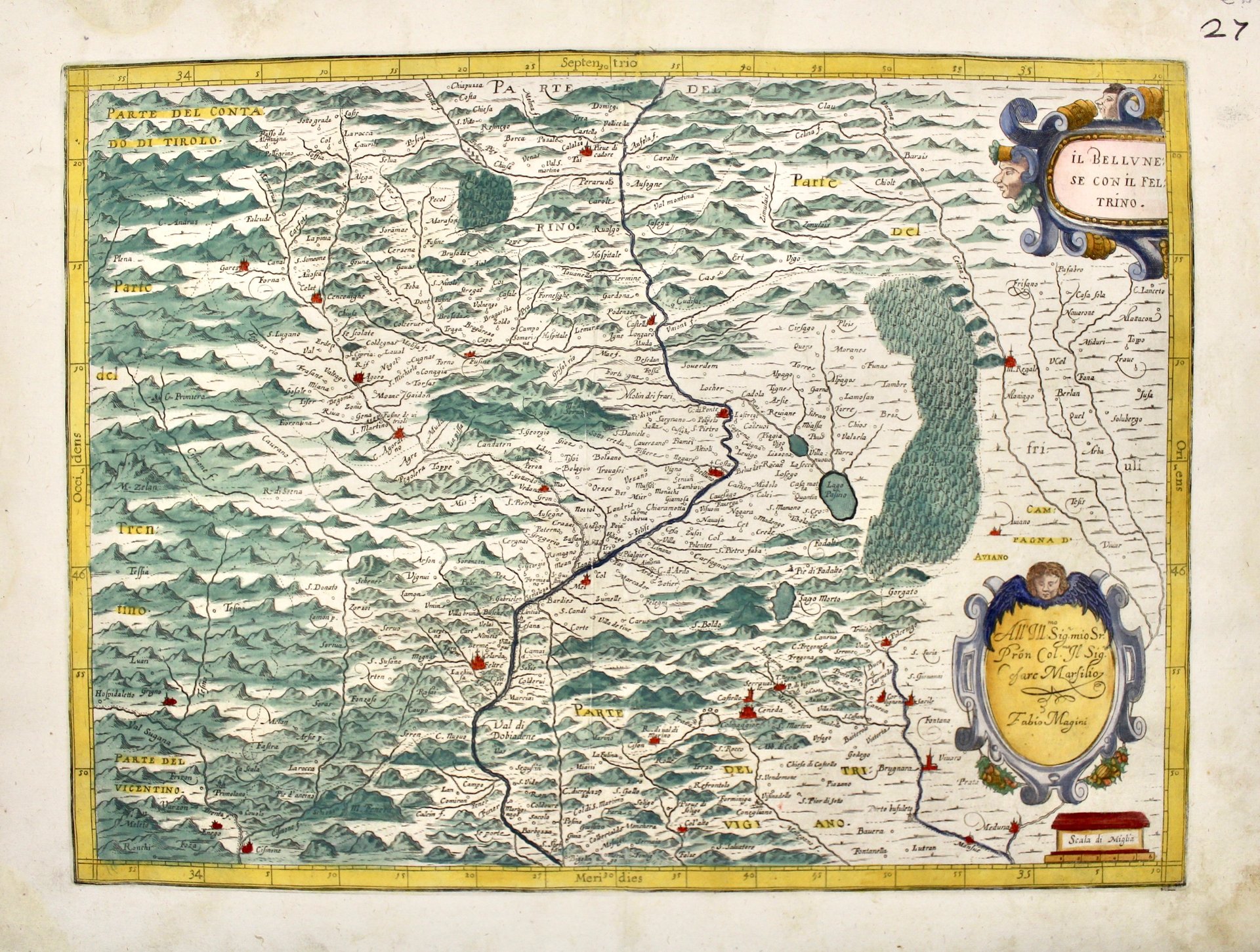 Incisione in rame, mm 356x460, dipinta a mano. Tratta da "Italia", l'importantissimo atlante pubblicato postumo da Fabio Magini, figlio del celebre astronomo e matematico padovano, il primo a delineare e concepire un atlante interamente dedicato all'Italia; per questa opera egli si servì di numerose carte inedite, che riuscì a reperire grazie a conoscenze personali. Il risultato finale assai originale, amalgama di lavori pubblicati a stampa in precedenza e topografie manoscritte, risultò influenzare, per la sua modernità, la cartografia della penisola fino all'inizio del '700. Esemplare in piacevole coloritura, due piccoli forellini alla piega centrale. Copper engraving, mm 356x460, hand-coloured. From "Italia", the very important atlas published posthumously by Fabio Magini, son of the famous Paduan astronomer and mathematician, the first to outline and conceive an atlas entirely dedicated to Italy; for this work he made use of numerous unpublished maps, which he managed to find thanks to personal acquaintances. The highly original end result, an amalgamation of previously published printed works and handwritten topographies, was to influence the cartography of the peninsula until the beginning of the 18th century. Nicely coloured, good example with two tiny holes at centrefold