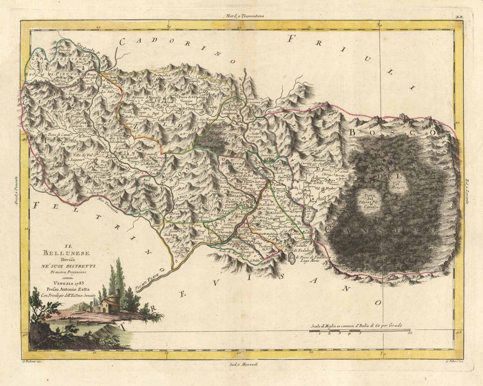 Carta geografica, antica ed originale, entro margine graduato, raffigurante il territorio del Bellunese con indicazione dei fiumi, monti, boschi e molte località con denominazioni in parte italiane ed in parte in dialetto. Sono citati i territori confinanti: Cadorino, Friuli, Feltrino e Trevigiano. Scala grafica di Miglia 10 comuni d'Italia di 60 per Grado. Coloritura coeva all'acquerello. L'incisione è inserita nel volume III del "Atlante novissimo illustrato ed accresciuto sulle osservazioni e scoperte fatte dai più celebri e recenti geografi", stampato a Venezia nel 1784, presso Antonio Zatta con privilegio dell'Ecc.mo Senato. Rif: Marinelli 1881: 1252. Autore: Zatta Antonio edit. - Zuliani C. inc. & Pitteri G. scr. Luogo: Belluno - Veneto. Anno: 1793. Tecnica: incisione in rame. Dimensioni: 305x400 mm