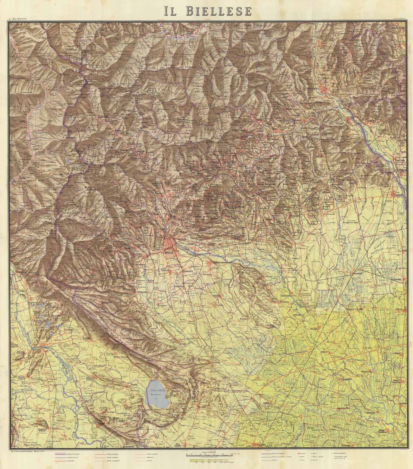 Grande carta geografica, stampata dalla Sez. Cartogr. Successori Besozzi a Milano nel 1938, raffigurante il territorio del Biellese. Da notare l'elevato grado di dettaglio del disegno topografico con indicazione dei Confini Provinciali, Confini Comunali, Autostrade, Strade Principali, Strade Secondarie, Strade Carreggiabili, Strade Campestri, Mulattiere, Sentieri, Ferrovie Principali, Ferrovie Secondarie e Tramvie, Funivie etc. Il disegno è realizzato con l'utilizzo di differenti colori per contraddistinguere le differenti altezze. Pieghe editoriali. Ottimo stato di conservazione