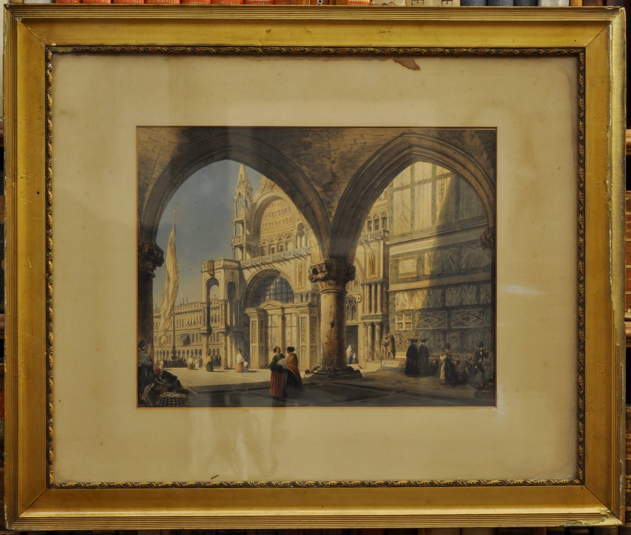 Litografia in coloritura originale di mm 396 x 298. Bella illustrazione storica dell'area antistante il Palazzo Ducale, detto Broglio. Molteplici macchiette popolano la scena, tra cui una "bigolante" ossia una venditrice d'acqua con il suo tipico bilanciere sulle spalle. Questo foglio in bella acquarellatura proviene dall'opera "Interiors and Exteriors in Venice", raccolta di litografie a tema veneziano stampate a Londra nel 1843. Si vende con cornice originale e vetro antico.Original color lithograph measuring 396 x 298 mm. Beautiful historical illustration of the area in front of the Doge's Palace, known as Broglio. Multiple specks populate the scene, including a "bigolante" that is a water seller with her typical balance wheel on her shoulders. This beautiful watercolor sheet comes from the work "Interiors and Exteriors in Venice", a collection of Venetian-themed lithographs printed in London in 1843. Sold with original frame and antique glass.