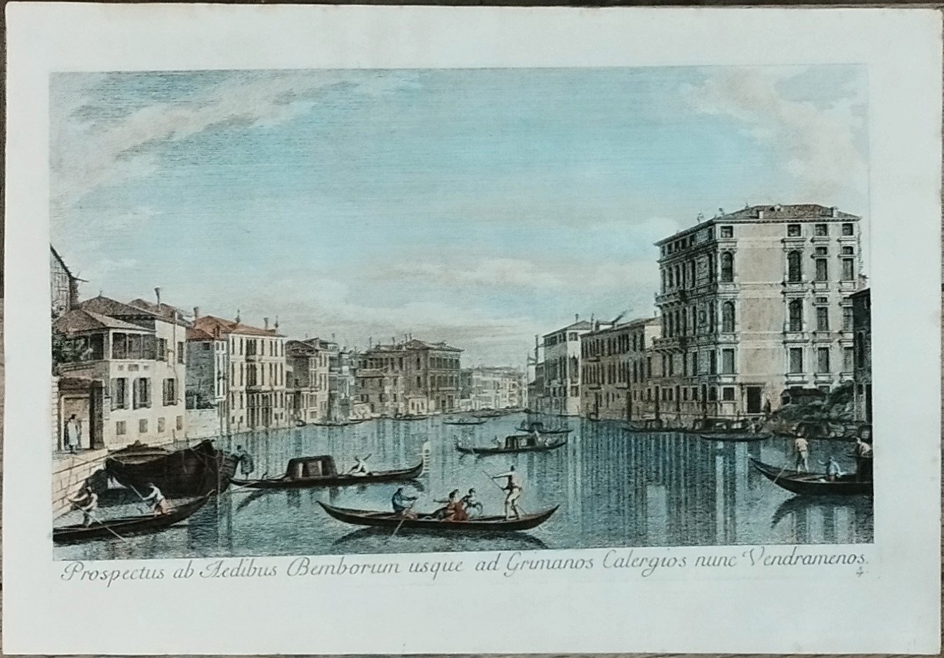 Incisione all'acquaforte in delicata coloritura di 426 x 269 mm. alla battuta su foglio di carta vergatina veneziana di 479 x 334 mm. Filigrana "Balestra". II stato su IV. Tiratura Pasquali. In basso al centro "Prospectus ad Aedibus Bemborum usque ad Grimanos Calergios nunc Vendramenos" e sulla destra "4" in numero arabo. Ottimo foglio a larghi margini. Incisione tratta dal più che celebre album inciso da Antonio Visentini dai disegni di Canaletto "Urbis Venetiarum Prospectus Celebriores, ex Antonii Canal Tabulis XXXVIII. Aere expressi ab Antonio Visentini. In partes tres distributi". Succi 2013 ".un dipinto di Canaletto, differente in alcuni dettagli, fa parte della serie di ventidue vedute commissionate dal Duca di Bedford verso la metà del quarto decennio" Moschini "Dell'Incisione in Venezia" - Pallucchini "Mostra degli Incisori Veneti del 700" - Morazzoni "Il libro illustrato veneziano del 700" - Succi "Prospettive di Venezia" e " Da Carlevaijs a Tiepolo" - Montecuccoli degli Erri "Canaletto incisore". (EN) Etching in delicate coloring measuring 426 x 269 mm. at the bottom on a sheet of Venetian laid paper measuring 479 x 334 mm. "Crossbow" watermark. II state on IV. Pasquali edition. At the bottom center "Prospectus ad Aedibus Bemborum usque ad Grimanos Calergios nunc Vendramenos" and on the right "4" in Arabic numeral. Excellent sheet with wide margins. Engraving taken from the more than famous album engraved by Antonio Visentini from Canaletto's drawings "Urbis Venetiarum Prospectus Celebriores, ex Antonii Canal Tabulis XXXVIII. Aere expressi ab Antonio Visentini. In partes tres distributi". Succi 2013 ".a painting by Canaletto, different in some details, is part of the series of twenty-two views commissioned by the Duke of Bedford towards the middle of the fourth decade" Moschini "Dell'Incisione in Venezia. " - Pallucchini "Mostra degli Incisori Veneti del 700" - Morazzoni "Il libro illustrato veneziano del 700" - Succi "Prospettive di Venezia" and "Da Carlevaijs to Tiepolo" - Montecuccoli degli Erri "Canaletto incisore".