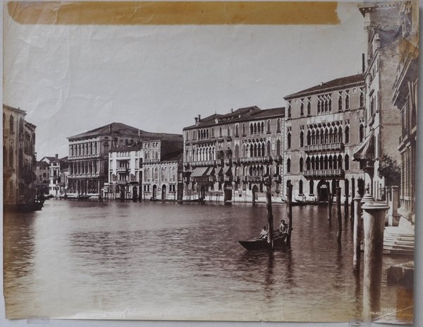 Fotografia originale da gelatina ai sali d'argento su carta baritata di mm 340 x 265. Un lungo pezzo di vecchio nastro adesivo al margine superiore. A china, in bianco, come spesso nelle fotografie di Naya, la dicitura : "252. Venezia Palazzi Foscari, Giustiniani e Rezzonico". Carlo Naya (1816-1882) fu uno dei più importanti fotografi italiani del diciannovesimo secolo; piemontese di nascita, di famiglia agiata, si trasferisce a Venezia nel 1857, associandosi con il già celebre fotografo Carlo Ponti, da cui si separerà nel 1868, aprendo due laboratori autonomi.