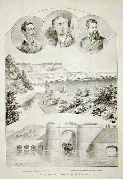 Rappresentazione in cinque vignette di due scorci del canale e degli Ingegneri addetti alla sua costruzione. Testo al verso.