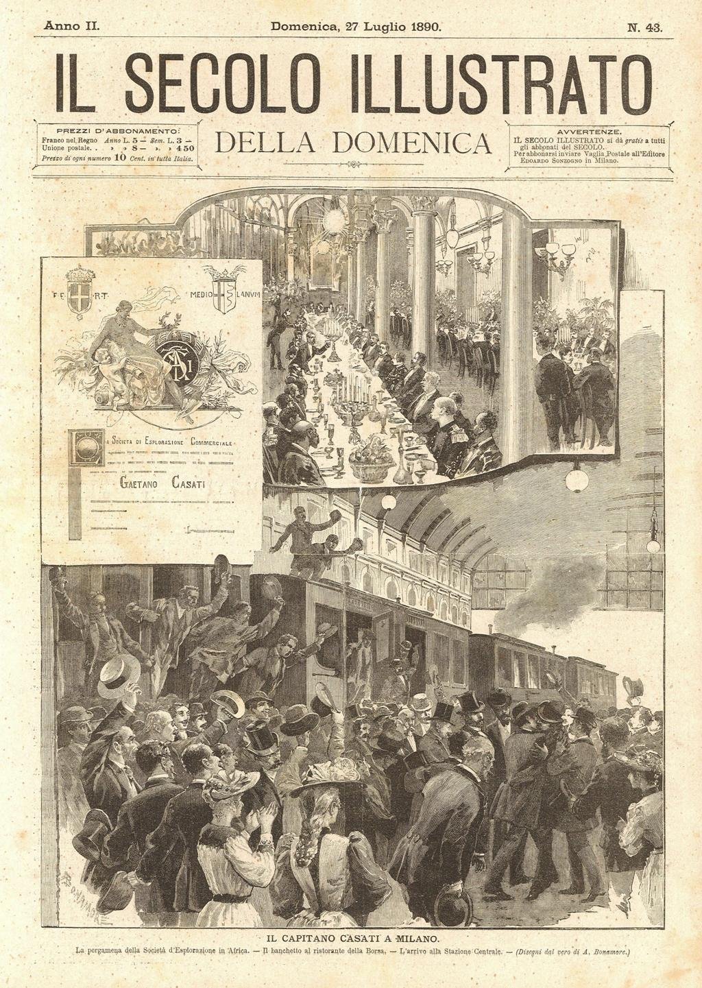 Stampa, antica ed originale, con raffigurazione del rientro a Milano dell'esploratore, dopo il suo lungo viaggio africano, per conto della Società Esplorazione Commerciale d'Africa. L'arrivo alla stazione e il banchetto in suo onore. Testo al verso. Autore: Bonamore A. dis. Luogo: Milano. Anno: 1890. Tecnica: xilografia. Dimensioni: 295x248.
