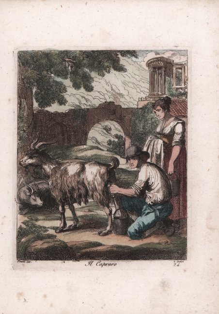 Costume popolare tratto dalla ' Nuova Raccolta di cinquanta motivi pittoreschi e costumi di Roma, 1810. Rara e bella serie, la seconda prodotta dall'artista, raffigurante costumi popolari singoli e in gruppo, scene e mestieri non solo di Roma e dintorni, ma anche di Campania, Calabria e Abruzzi. Stampatore, pittore, scultore e disegnatore italiano. Apprese i rudimenti della scultura dal padre, artigiano di piccole statuette religiose di scarso valore. Questo apprendistato in tenera età incoraggiò Pinelli ad enfatizzare la plasticità e l’espressione rispetto ai valori del Neo-Classicismo, predominanti a Roma. Purtroppo, sono pervenute fino a noi solo pochi esemplari delle sue sculture in terracotta, mentre conosciamo il volume di acqueforti, Gruppi pittoreschi (Roma, 1834), con rappresentazioni di popolani. L’enfasi sul naturalismo e su soggetti di vita quotidiana è di nuovo evidente. Sebbene avesse studiato presso l’Accademia di Belle Arti a Bologna, sostenuto economicamente dal Conte Lambertini, il nipote di Papa Benedetto XIV, Pinelli non aveva interesse a seguire l'iter tradizionale del successo artistico attraverso i soggetti religiosi. Di ritorno a Roma, alla fine del XVIII secolo, decise di vendere le sue opere nei caffè frequentati dai turisti. ' Incisione in rame, finemente colorata a mano, in ottimo stato di conservazione. Popular costume from ' Nuova Raccolta di cinquanta motivi pittoreschi e costumi di Roma, 1810. Rare and beautiful series, the second produced by the artist, depicting individual and group popular costumes, scenes and crafts not only of Rome and its surroundings, but also of Campania, Calabria and Abruzzi. Italian printmaker, painter, sculptor and draughtsman. He learnt the rudiments of sculpture from his father, a maker of cheap religious statuettes. This early training encouraged Pinelli to emphasize plasticity and expression over the Neo-classical values prevalent in Rome. Although only a few of his terracotta figures survive however, he did produce a volume of etchings, Gruppi pittoreschi (Rome, 1834), depicting rustic groups. Its emphasis on naturalism and everyday subject-matter is also characteristic of his sculptures. Although he studied both at the Accademia di San Luca in Rome and at the Accademia di Belle Arti in Bologna, helped financially by Conte Lambertini, Pope Benedict XIV’s nephew, Pinelli was not interested in pursuing the traditional path to artistic success via religious or history painting. On returning to Rome in the late 1790s he chose to peddle his works at the cafés frequented by tourists. Copperplate, finely hand coloured, in excellent condition. Cfr.